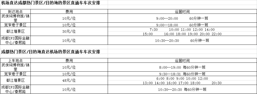 在1号航站楼与2号航站楼之间(原支线航站楼出港厅)有机场开往省内其他城市的大巴,前往都江堰、乐山、西昌等地的有人,可以直接乘车前往。可提前五天购买预售票,咨询话:028-85205360。