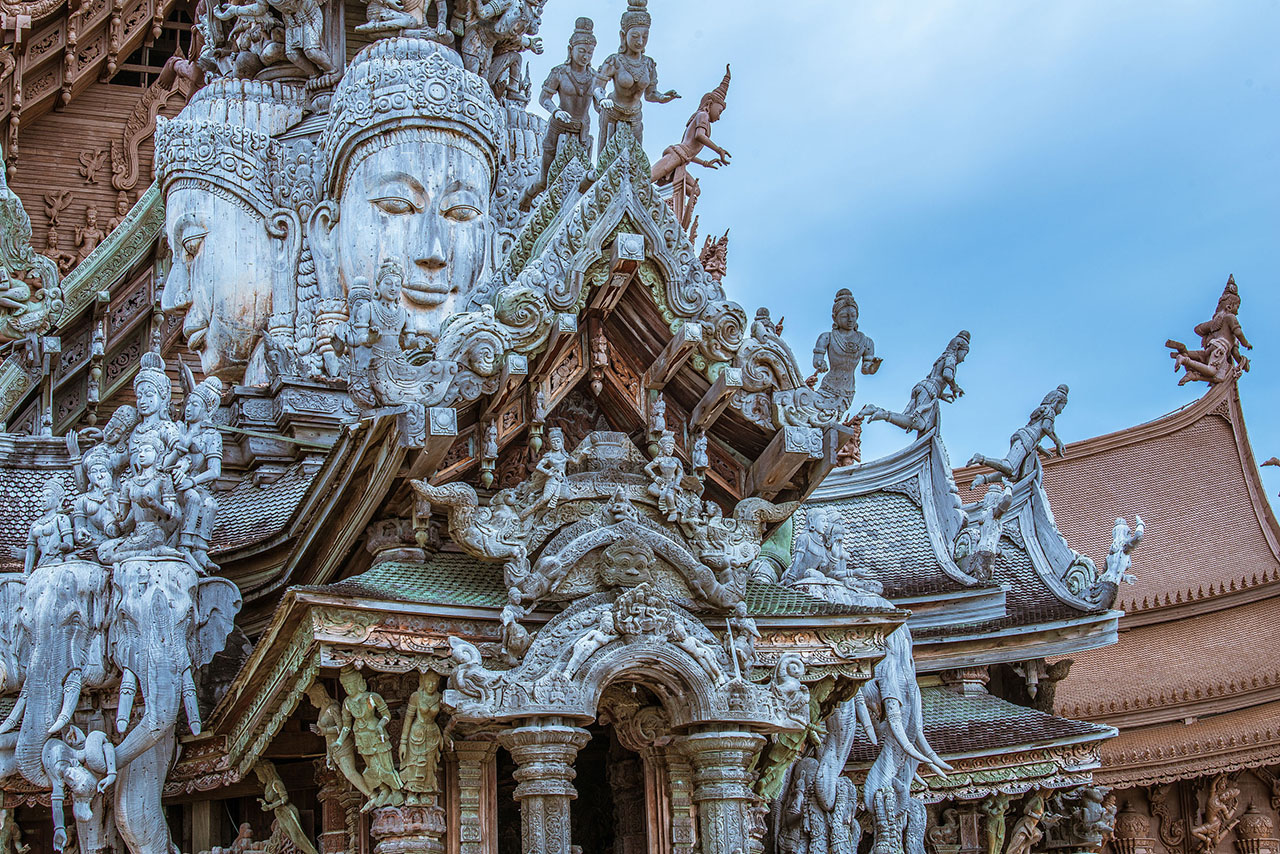由纯红木和柚木建造而成的真理寺木雕工艺精湛,欣赏泰国传统建筑风格的同时还可以参与寺内的骑大象等特色活动,围绕着真理寺转一圈,感受寺外面海风的吹拂,非常惬意。