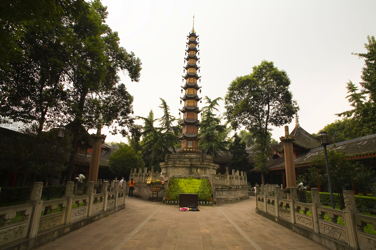 除了大殿建筑,在文殊院有一座千佛塔是即使绕道也一定要去看看的,穿过藏经阁旁边的园林,再经过祖殿和圆通殿便能到达那里了。千佛塔的全称是“千佛和平塔”。从远处望去,它大概有7楼那么高,庄严雄伟很有气势,每层塔角还都挂着一个铜铃,微风吹过会发出一阵“叮叮当当”的声音,实在是为文殊院这座千年古刹增彩不少。