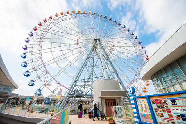 当你坐在摩天轮内,临海美景尽收眼底,缆车内还有可爱的卡通物“陪伴同游”。从摩天轮上可以俯瞰奥特莱斯和大阪湾,尤其是日落时分的景象,别有一番风味。摩天轮下面还有一条美食街,中餐、西餐、当地特色等等都有,出示护照还能免税。