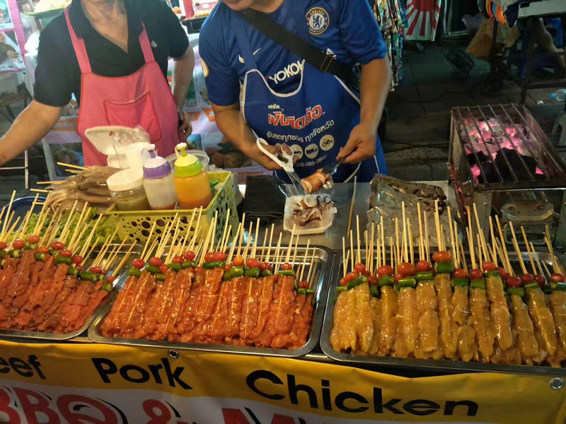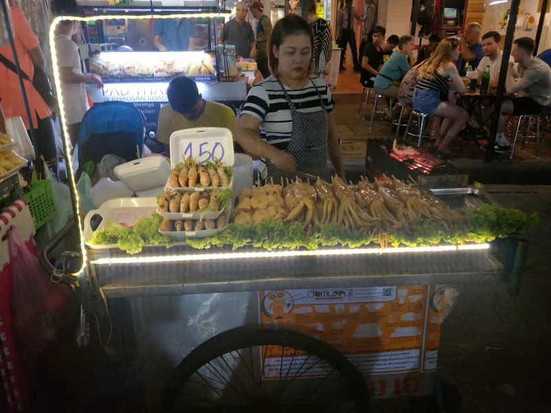 考山路整条街到处都是芒果糯米饭和其他泰国甜点,以及泰式炒粉、煎蛋饭、烤鸡块、泰国东北部的烤香肠、黄焖鸡米饭、新鲜的水果、椰子冰淇淋、炸昆虫......路上会有人拿着油炸蝎子问你,敢试试吗?