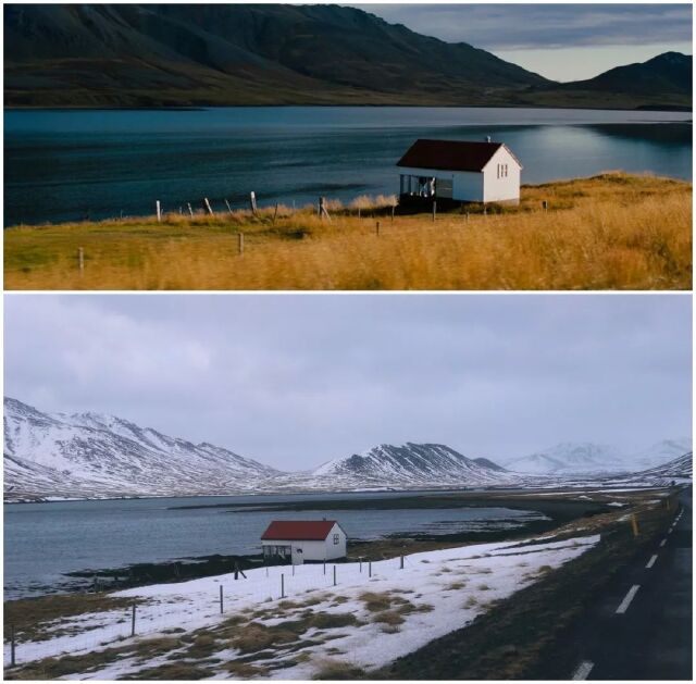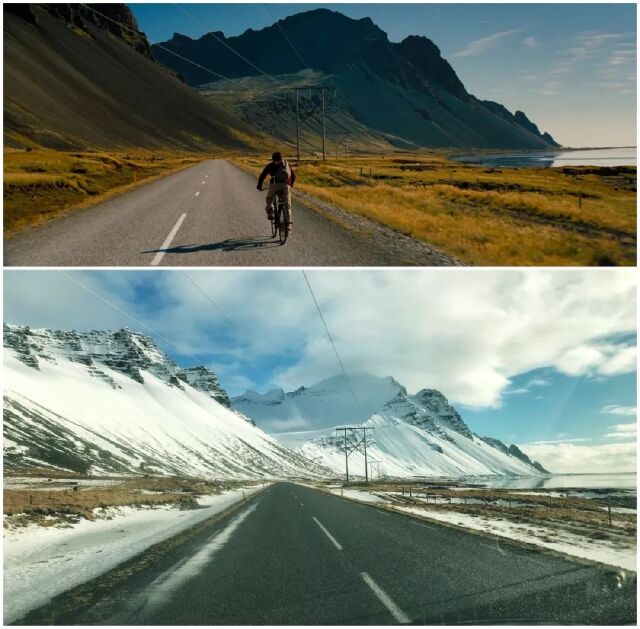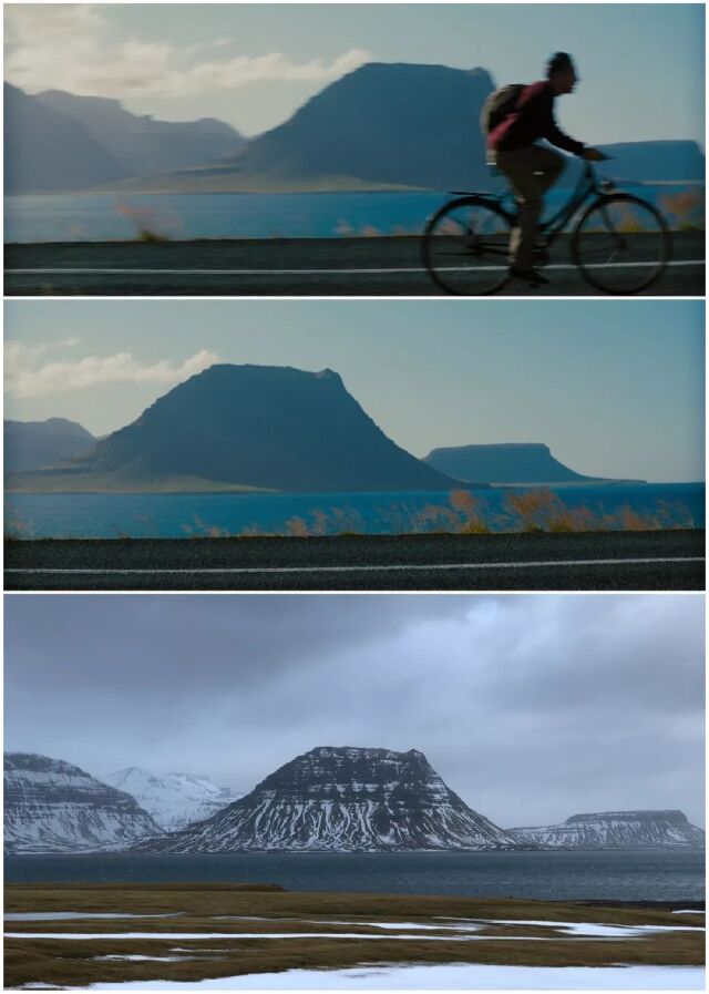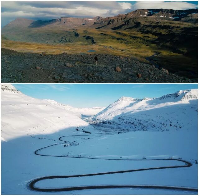 下面就是电影中在冰岛拍摄的场景截图和我去到冰岛拍摄的实地照片。