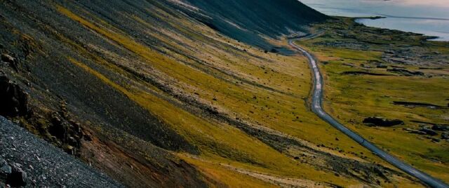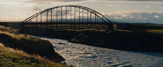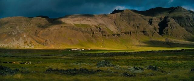 下面两张图地点接近,由于电影镜头拉的很远有畸变,我没有拍到类似的,但是看山体形貌,应该是在赫本附近,找了个大致的经纬度64.3847880,-15.3277460。