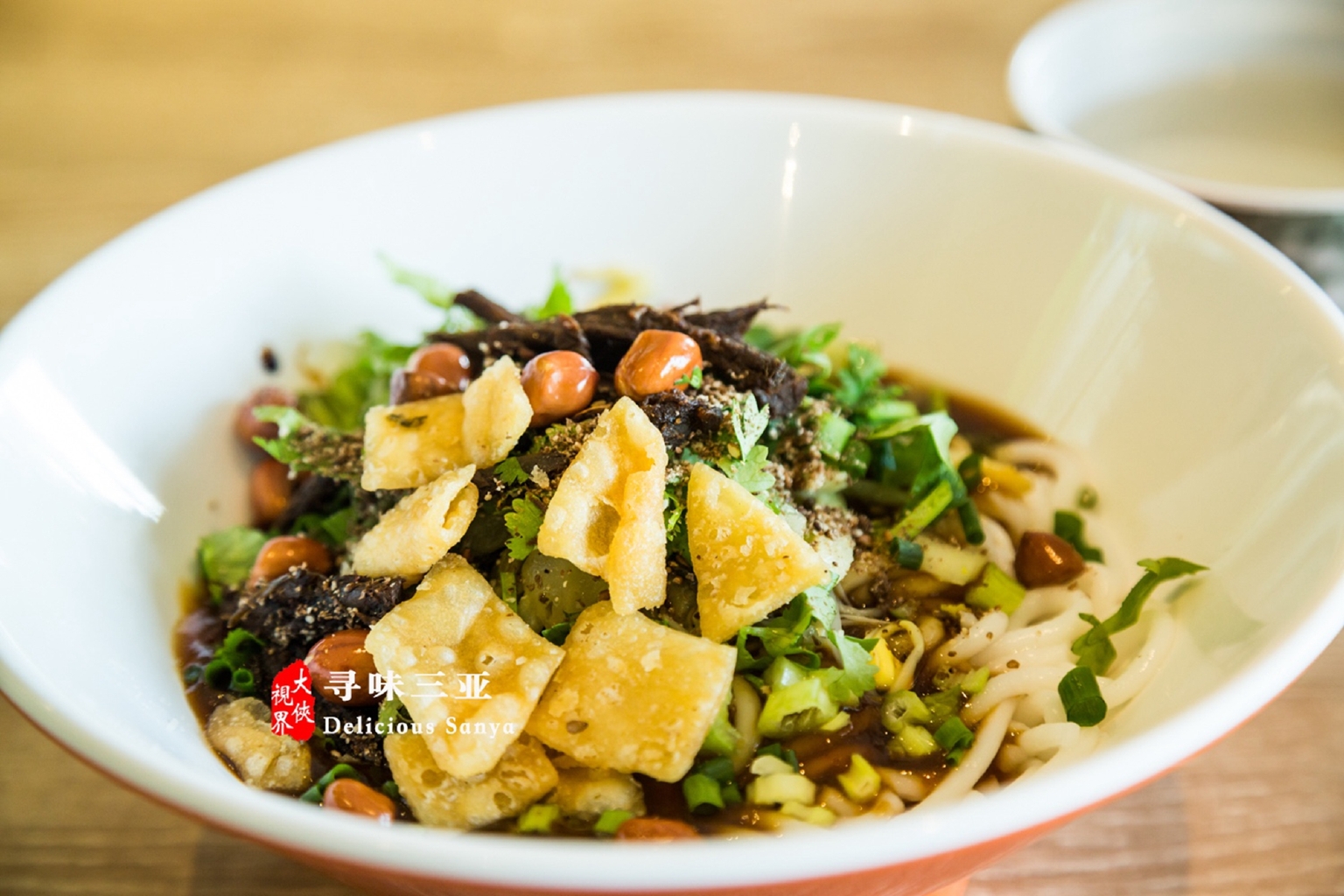 点了招牌的干捞海南抱罗粉,酱料极为丰富,有花生,有牛肉干,还有薄脆,爱吃辣的一定不忘加一点辣椒酱会更起味,吃到末尾剩下少量粉时,加进一小碗热腾腾的海蚌汤掺和着吃,更是满口喷香,回味无穷。