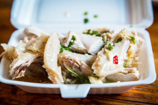 终于等到十一点半,老板问我们要多少,阿伟说各来一份,一份15元。看到老板从桶里拿出鸡的瞬间我开始相信阿伟了,不得不说,来过很多次三亚,也吃过很多顿文昌鸡,但是没有一次的文昌鸡能与眼前的文昌鸡相比,视觉上看鸡肉更嫩滑,极有食欲。