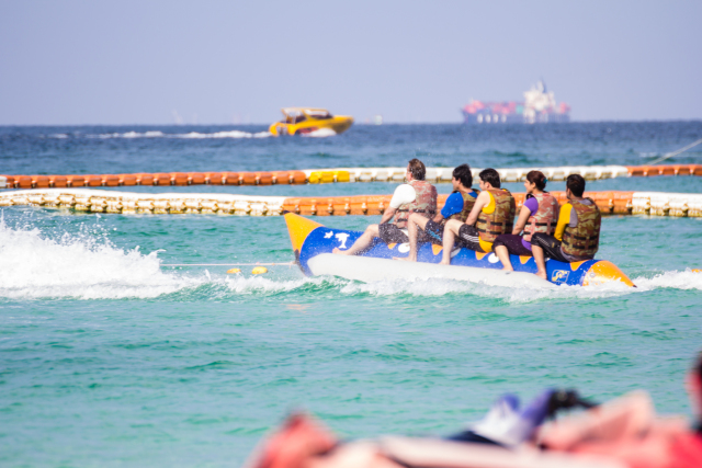 香蕉船是老少皆宜的入门级水上娱乐项目,由快艇飞速牵引着大香蕉在海上展现“轻功水上漂”,如果想要刺激一点,也可以要求船长开快点,体会一把飞速漂移,全身湿透的快感。