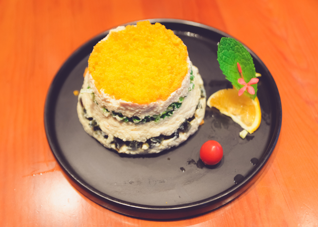 豆腐蛋黄堆是一个凉菜,豆腐是一层一层扑上去的最上面是一层蛋黄,外形很好看也很有创意,味道也很不错。