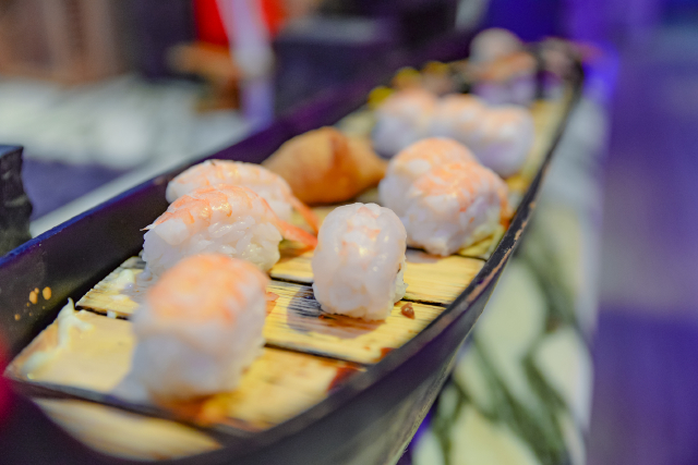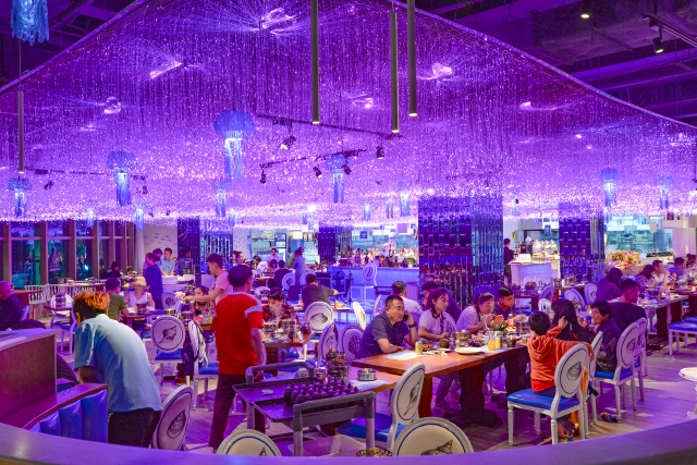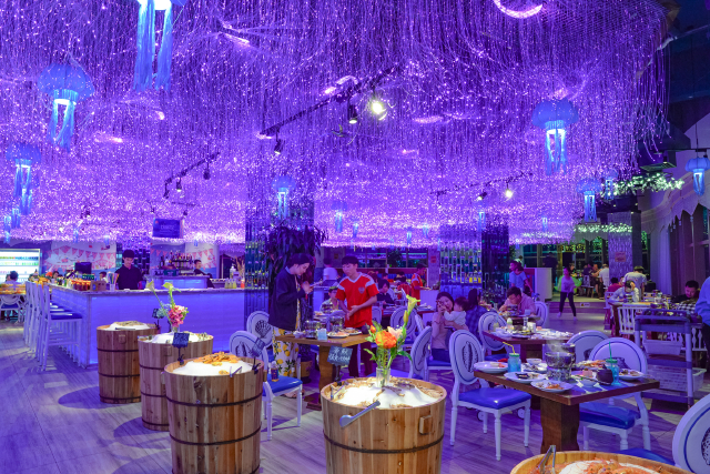 大悦洋是一家在三亚颇具口碑的海鲜自助餐厅,餐厅就位于三亚标志性的建筑大菠萝购物广场南区四层,走进餐厅不管是从整体还是局部,都透出梦幻般的浪漫气息,天花板上的蓝紫色小灯,如同满天繁星又像海洋里灵动的生命,在这样的用餐环境下,吃饭也仿佛变成了一次高雅的体验。