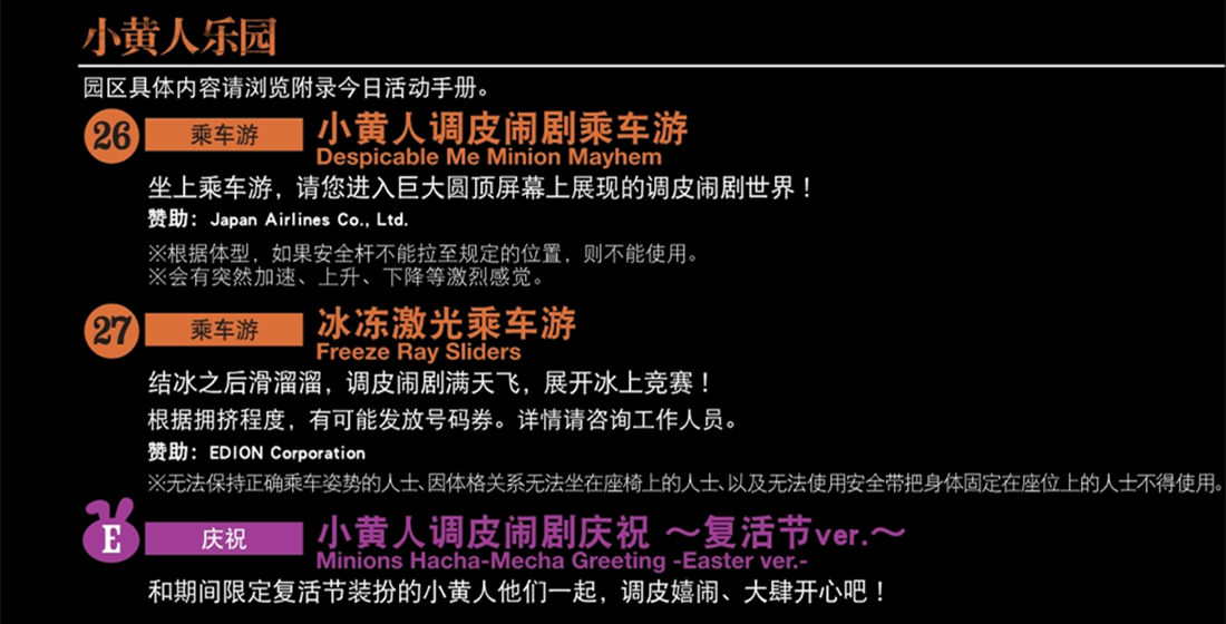 (1)两大游乐设施:小黄人调皮闹剧乘车游、冰冻激光乘车游。