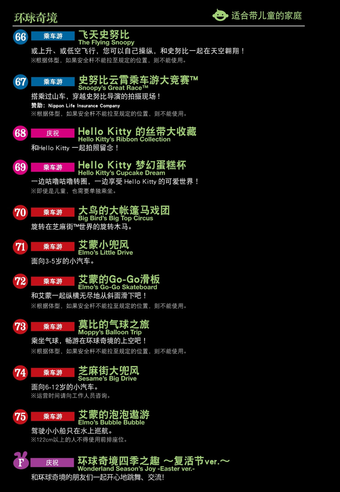 (1)四大游乐设施:飞天史努比、史努比云霄乘车游大竞赛、Hello Kity 梦幻蛋糕杯、莫比的气球之旅