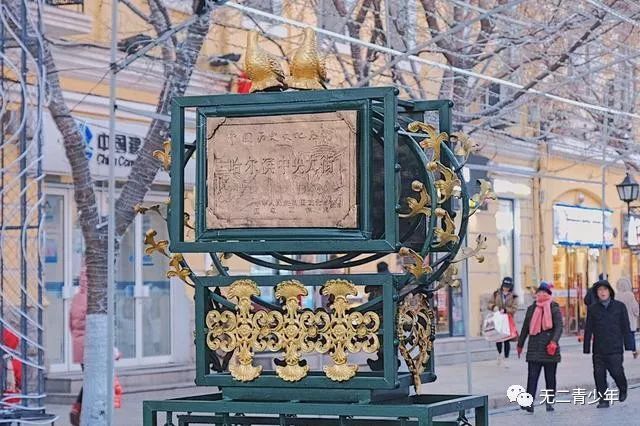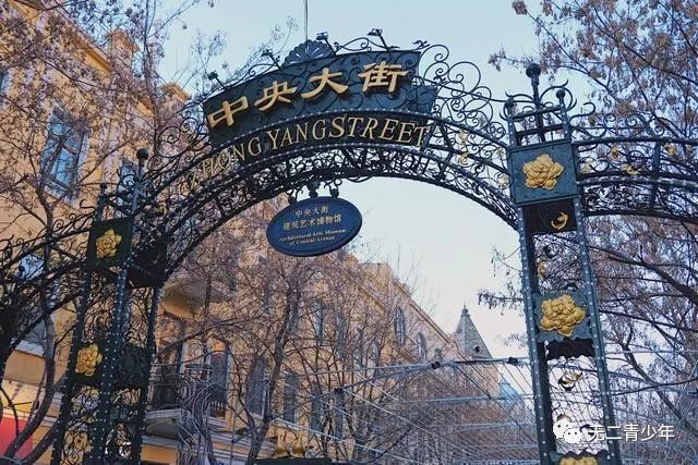 中央大街的大门是一个欧式复古铁门,门上写着中央大街艺术建筑博物馆。