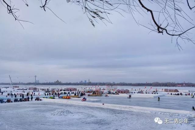 望着冬日万里冰封的松花江,第一句歌词就一直在我脑里洗脑循环。在松花江上有一个马迭尔公司打造的哈尔滨江上大众冰雪嘉年华,江上冰雪嘉年华不收取门票,免费开放。园内分免费和付费项目,据说免费的公益项目不少于整体活动面积的50%。