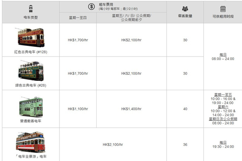 电车全景游,提供两条路线带你穿梭香港主要景点及地标。设有两个上下客点:分别为上环(西港城)及铜锣湾。并有八种语言之广播作沿途导览。大家可以官网订票。如电车未满座,也可以现场向「电车全景游」职员购票。座位先到先得,已于网上预订旅程的乘客可优先上车。电车全景游的票价为95港币。