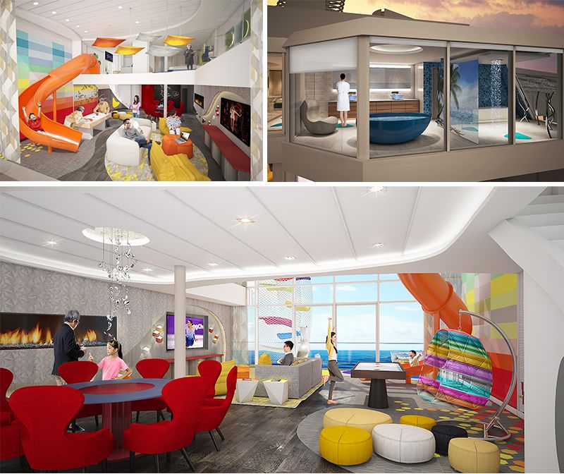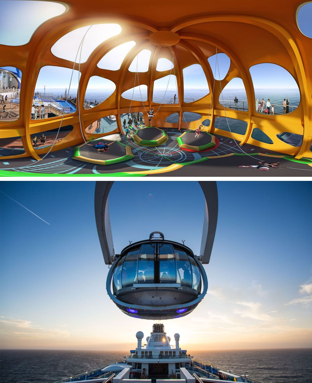 位于船尾的标志性设施南极球(Sky Pad),含有4个蹦极床,为宾客模拟穿越地心之旅,以VR科技创造全新体感历险体验;量子系列最受欢迎的北极星(North Star),通过透明玻璃舱将游客送往距离海面300英尺以上的高空,享受360度的壮观景象;甲板跳伞(RipCord by iFly),用风洞模拟令人心跳加速的跳伞体验;以及甲板冲浪(Flow Rider),以长达12米的造浪器,让宾客在甲板上便可纵情享受冲浪乐趣。
