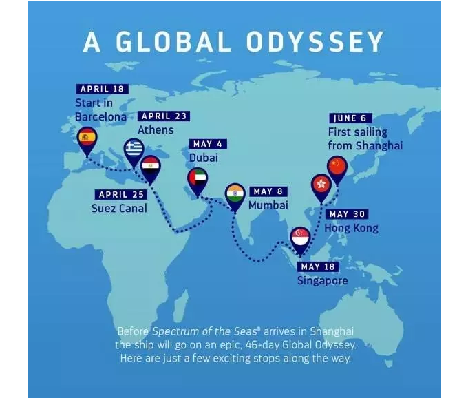 在开启中国母港航季之前, “海洋光谱号”将从西班牙巴塞罗那启航,展开为期47天的奥德赛环球之旅,期间将带领宾客领略约旦亚喀巴、阿联酋迪拜、阿曼马斯喀特、印度科钦、马来西亚乔治敦港的壮丽美景。
