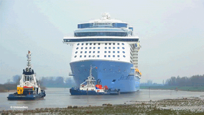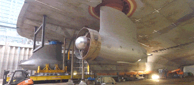 两个吊舱式推进系统和螺旋桨安装到位,以41兆瓦马力,134rpm的转速,实现每小时23.7节的航速。
