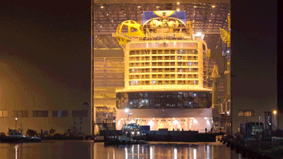 在干船坞内注水217,000立方米,相当于86个标准奥运泳池的水量,一直到船坞里的水面与船坞门外河面持平,然后由两条9000马力的拖轮拽出船坞。