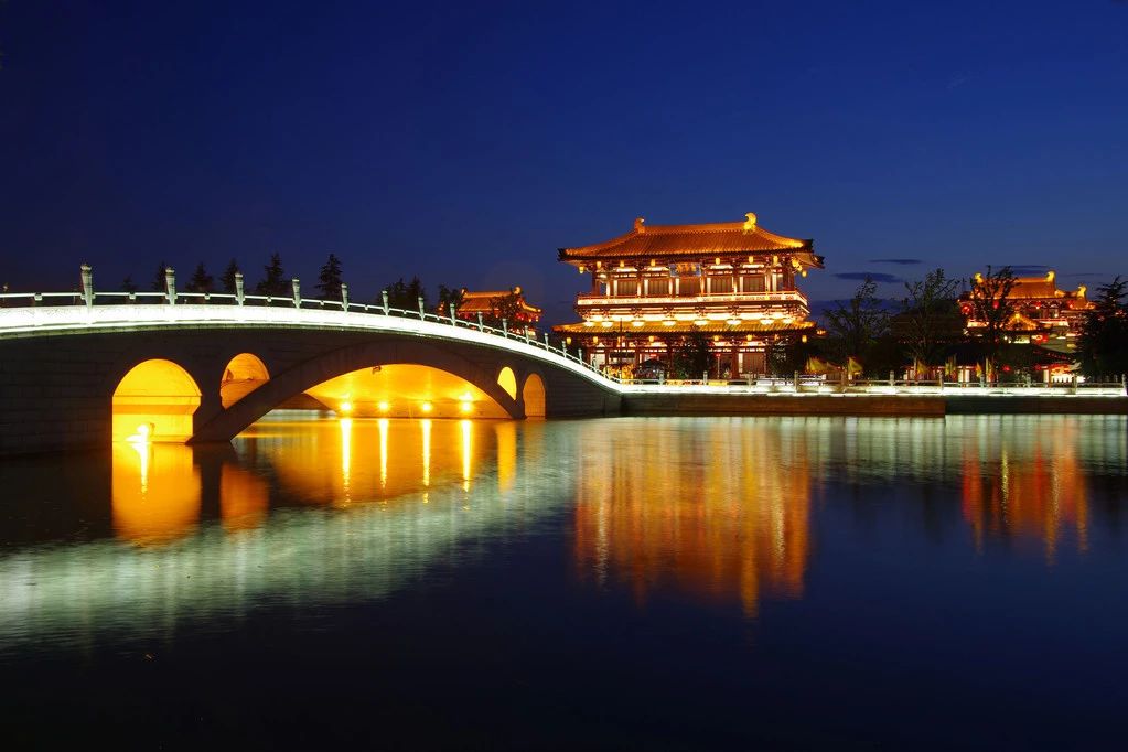 夜景色彩璀璨,灯火辉煌中的唐文化长廊、芳林苑、紫云楼等地,处处灿烂夺目。