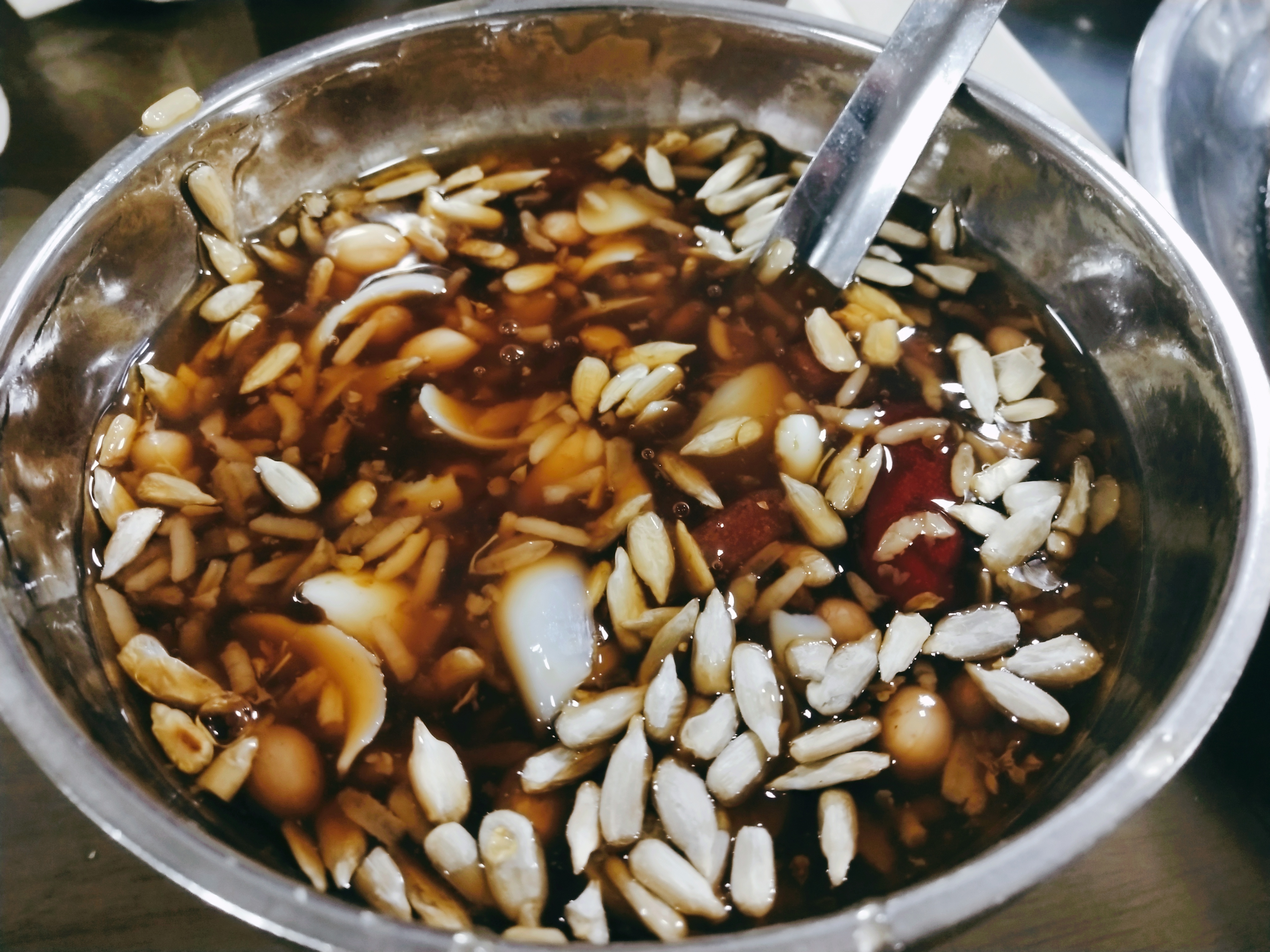 这碗八宝粥和南方这边的还是稍许有点不大一样,没有什么米,反而花生、瓜子比较多,清爽甜沁人心,在走了一路之后歇息之时,来上这么一晚,心情大好呢!