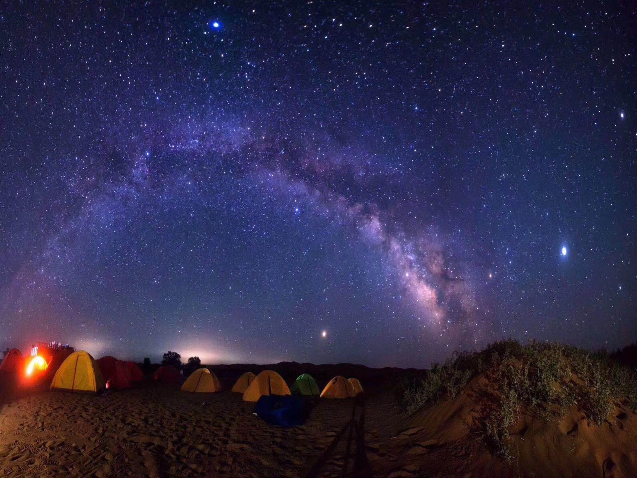 沙漠里没有PM2.5这个名词,抬头看见的不是漫天雾霾,夜晚繁星点点。晚饭后坐在沙丘上吹着清风抬头就能看见浓稠墨色的天空中点缀着满天的繁星,像夜的精灵打碎了一地的阳光。
