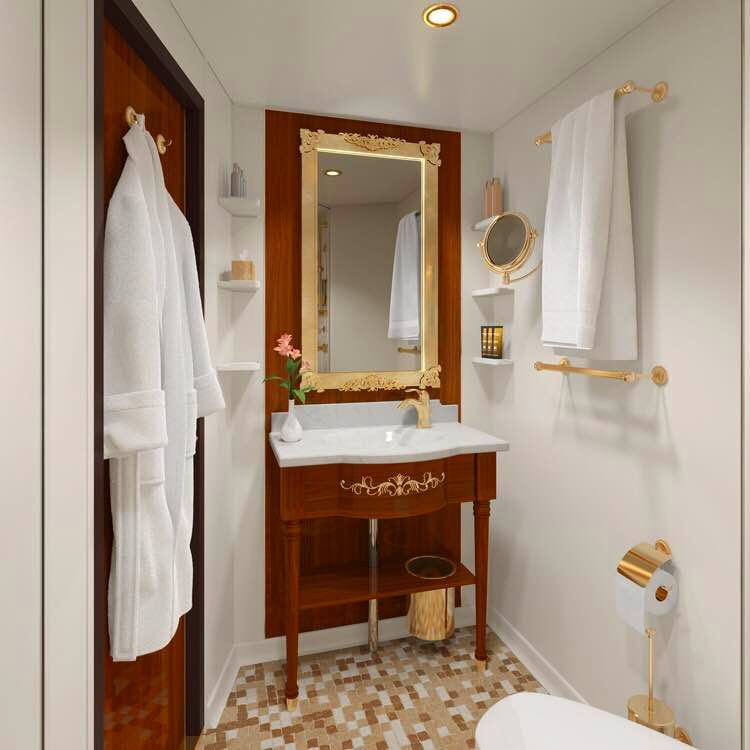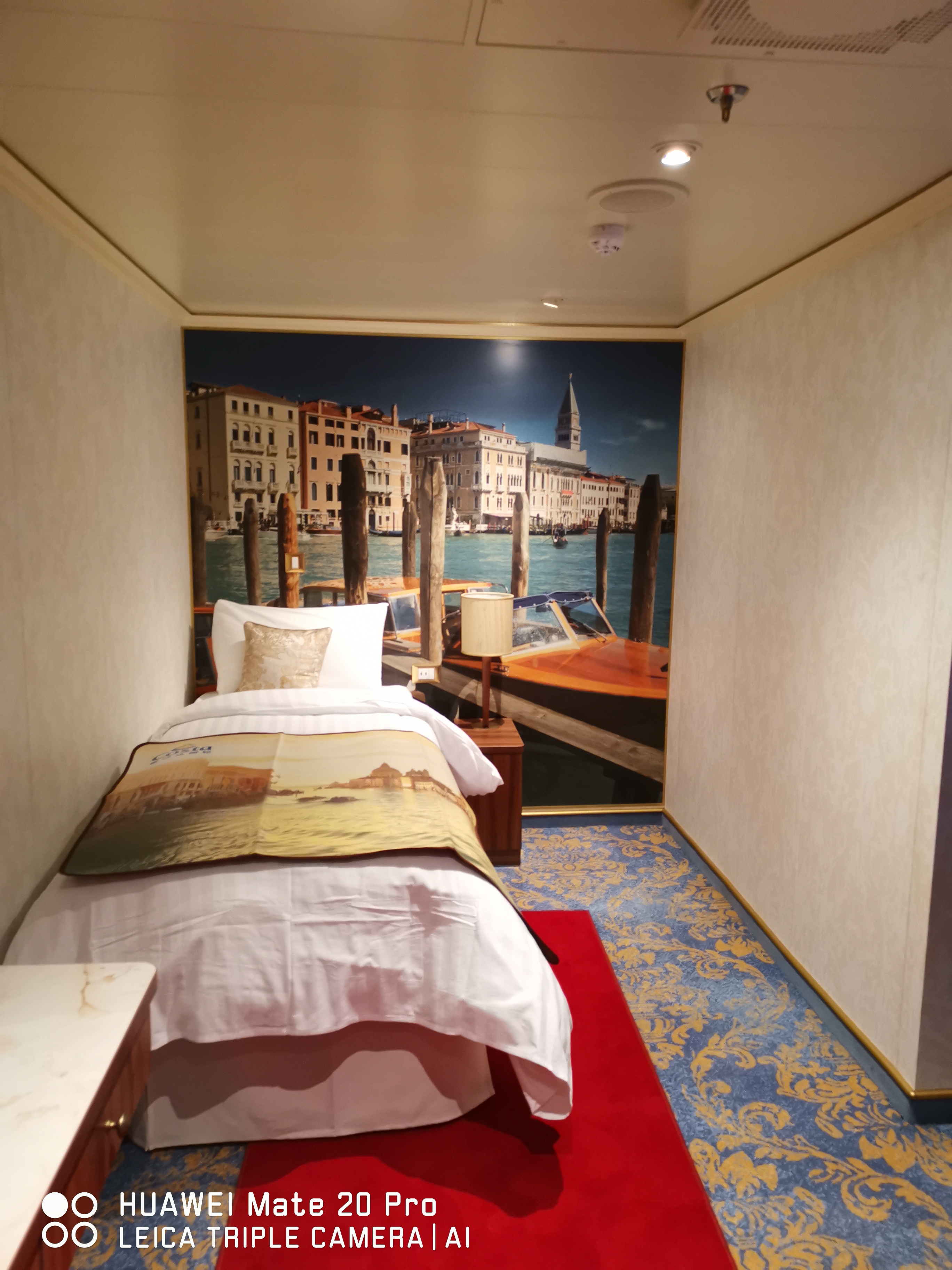 房间均是由两张单人床组成大床,可让客房服务员拆分。内舱家庭房第三第四张床为墙上下拉床,海景/阳台/套房为沙发床和墙上下拉床,下拉床或沙发床可让客房服务人员翻下。房间内有电热水壶、小冰箱、吹风机、电话、保险箱等。船上的额定电压为110-220伏交流电,房间内插座为欧标(两眼圆插),客人需自行携带转换插座。请自备牙刷、牙膏、拖鞋、梳子、剃须刀等个人用品。每位乘客可携带少量私人用品,如沐浴露、洗发水、护肤液等。
