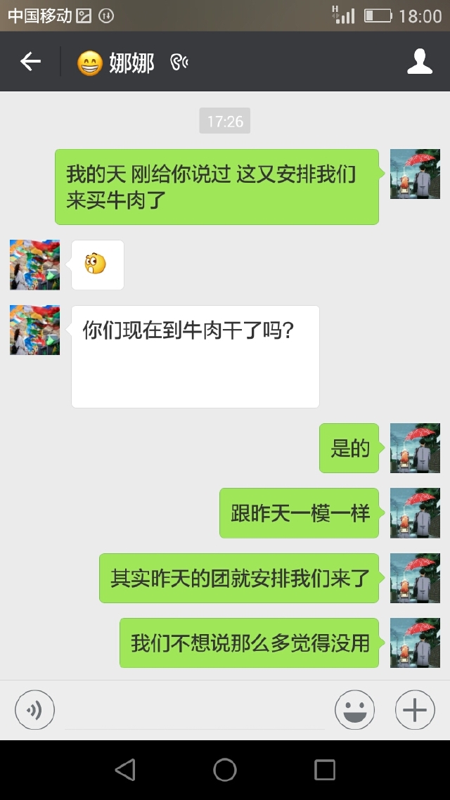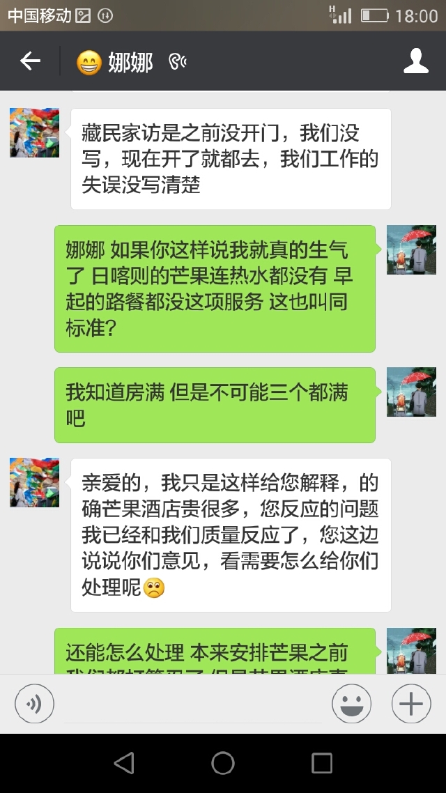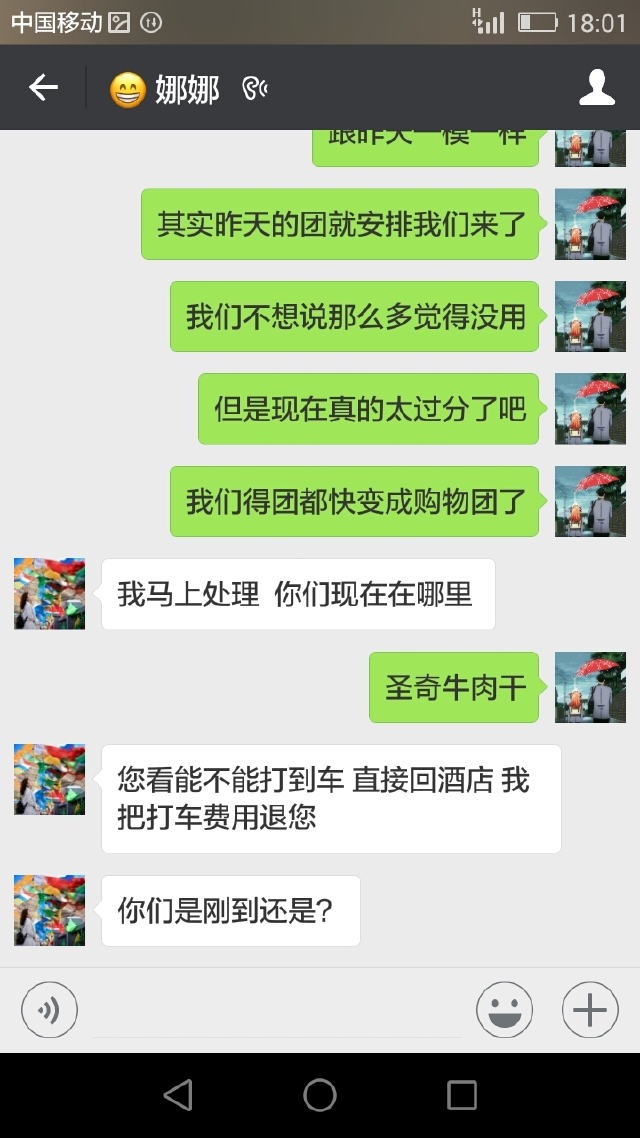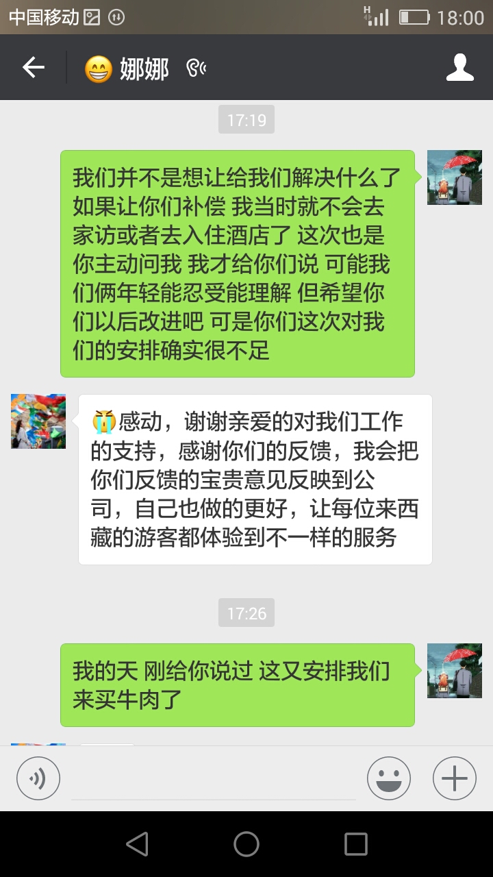最后一天,纳木错也是超级不顺。开始通知自己想办法去布宫白塔集合。我们跟旅行社联系,旅行社说“自己打车吧 我报销”。早起6点你让我们去哪打车?好说歹说,同意送我们到布宫。从纳木错回来,车头一拐,又进了昨天的牛肉店!当时我和老公真的气疯了,我们明明是纯玩,而且纳木错就是你们补偿给我们的,结果又拐进昨天一模一样的牛肉店了!我给旅行社联系,旅行社又是“打车吧 我报销”,我就请问了,如果都要我操心,交你们钱干嘛?最后还追着你们旅行社要钱?而且全程旅行社没有给我打一次电话! 即使在我特别无助生气的时候我说你不能给我打个电话吗? 等了好久依旧码字关心!我一气之下就把西藏旅行社微信删了,反正明天就要回家了,没你们一样,因为去机场也是做机场大巴,然后退钱……呵!呵!