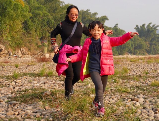 现在正是枯水期,我们走在河道上,踩着圆滑的漓江石,漫步中亦享受着足底按摩的乐趣。