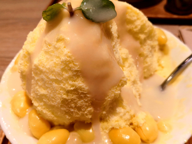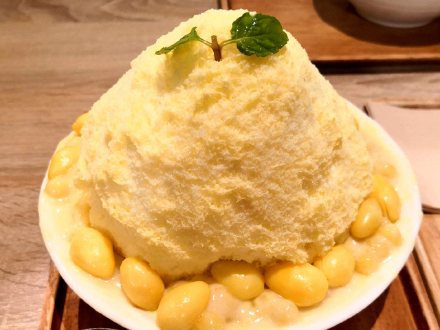榴莲糯米刨冰,这属日式刨冰,标准身高是碗高的3~4倍。嫩黄的冰沙砌得相当结实,鲜奶油从刨冰的顶部流下,凝固在刨冰的腰间,仿佛,山顶没有融化的雪,再用薄荷叶点缀。刨冰几乎是粉状,十分细腻,本身就是榴莲味,入口即化,一掏心窝子,榴莲及糯米,Q弹糯米裹着榴莲,美妙的搭配,每份刨冰还配了新鲜榴莲做成的果酱,淋在刨冰上面,很加分!