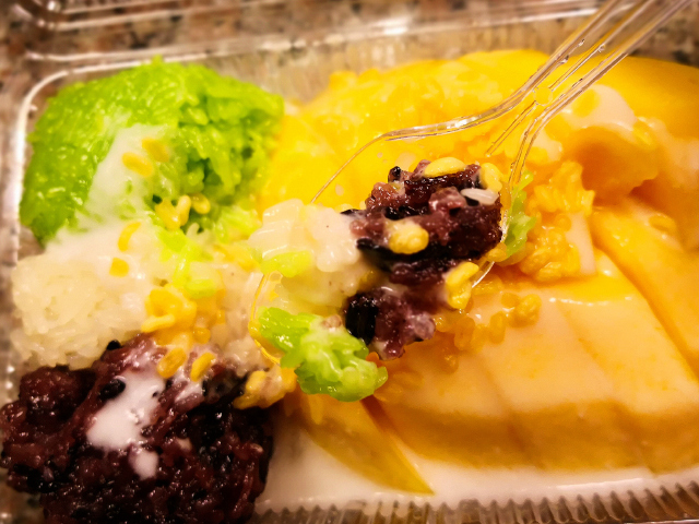 这个芒果糯米饭的芒果都是用优质泰芒,蒸煮的白色糯米飯+斑斓叶汁煮的绿色糯米飯,外加用盐炒香的绿豆和香甜的椰奶,糯米饭既不太湿也不太干,粒粒分明,但糯软。甜度适中不腻。巧妙的將芒果的酸甜,椰奶的香气,酥脆的綠豆還有軟糯Q彈的糯米結合起來,几种口感的融合,在口中咀嚼。