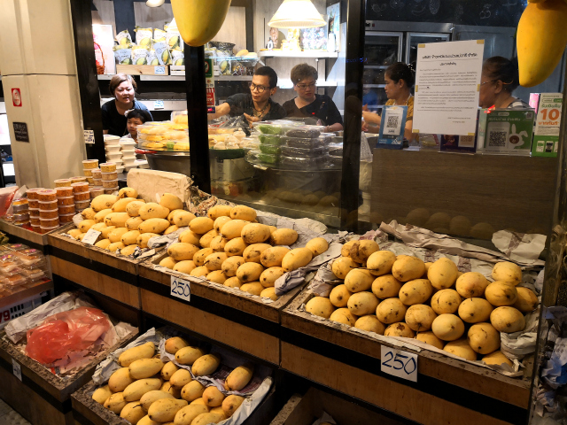 走到店门口,被大大的芒果吸引,门口摆满了芒果和芒果做的食品。