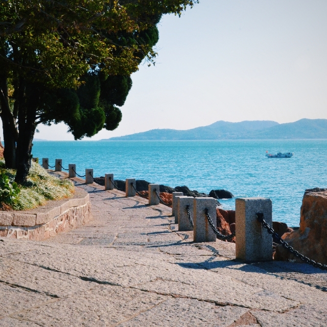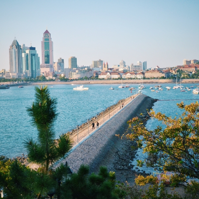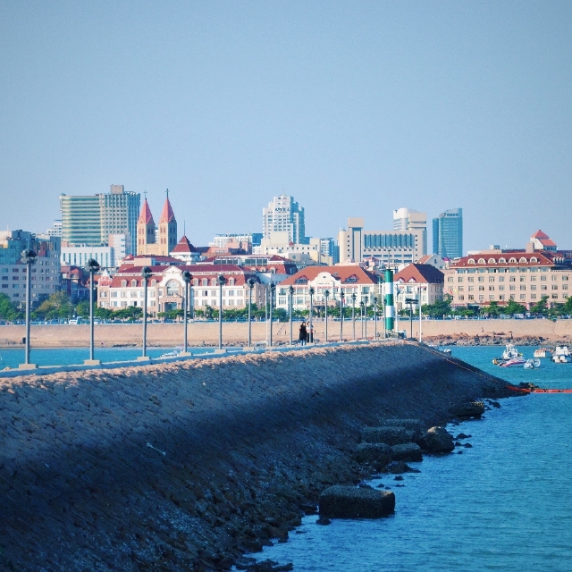 这就是小青岛。小青岛原本和陆地相连,后来由于海水的冲刷逐渐和陆地分开,现在通过一条长长的堤坝和陆地相连。小青岛面积不大,如果走马观花不需十几分钟便可走完。但要是认真逛起来,这里真的有一步一景的感觉。岛的背面有一条防波堤,沿着防波堤望去,栈桥、信号山、小鱼山尽收眼底,传说中的红瓦绿树碧海蓝天就是眼前的样子!