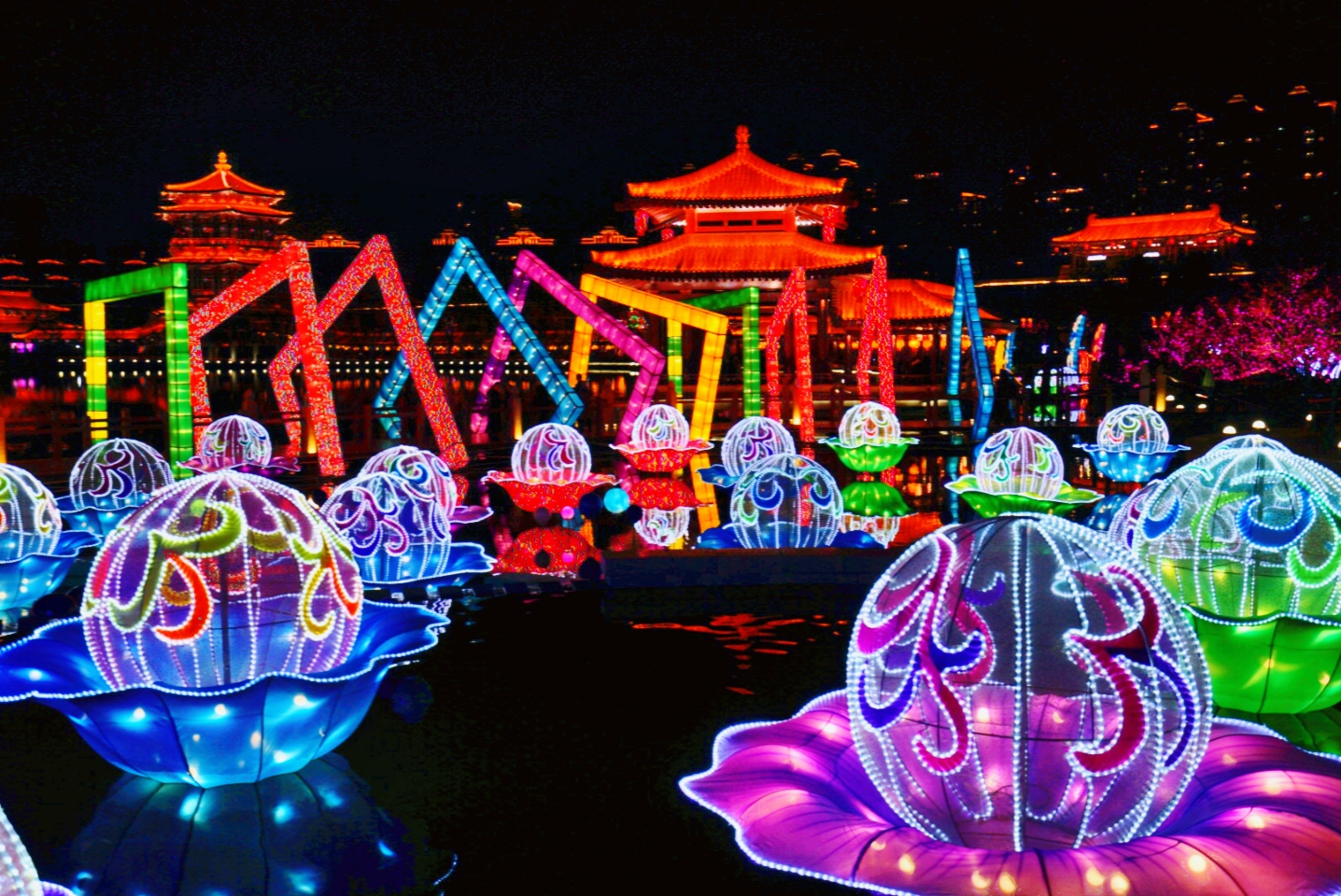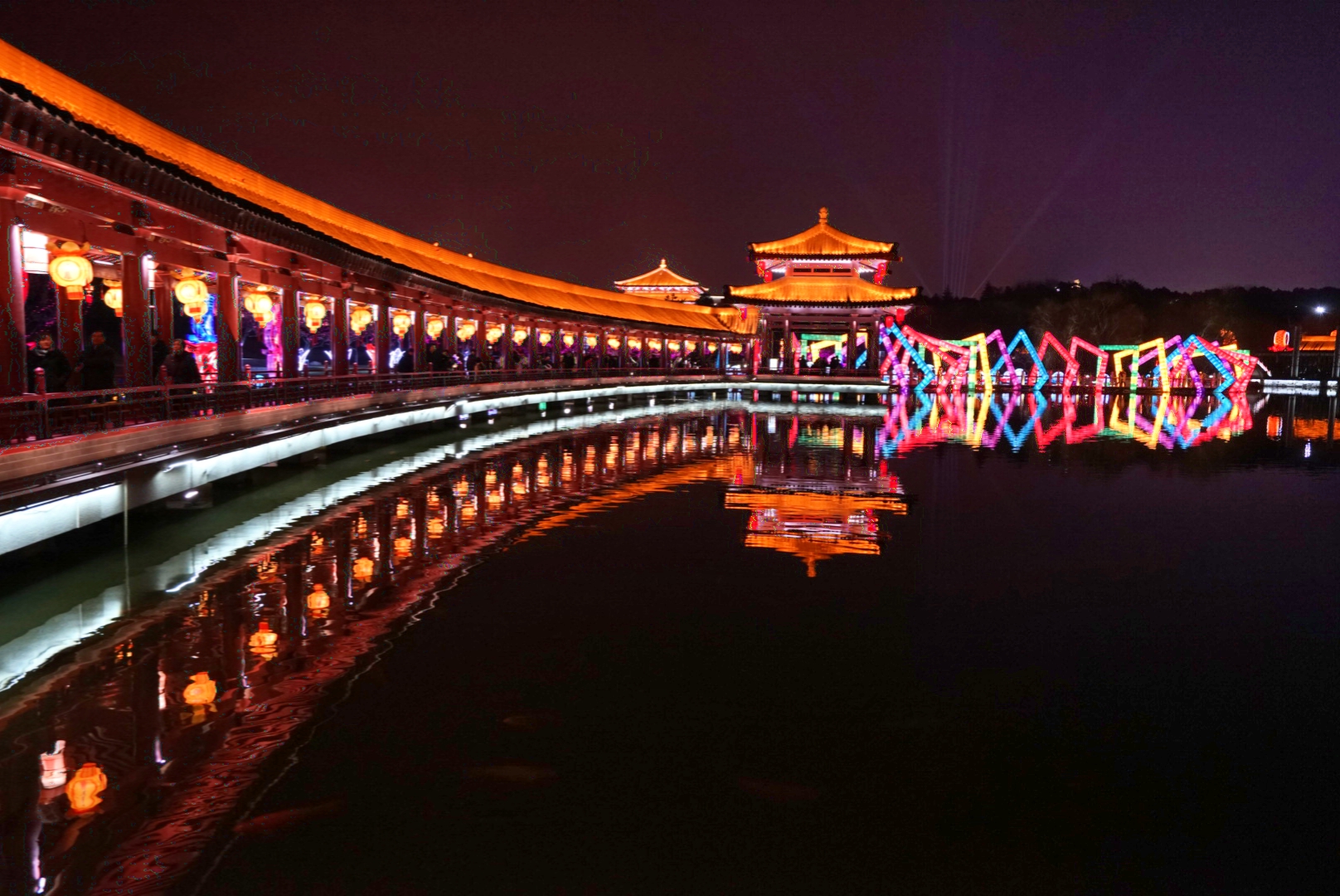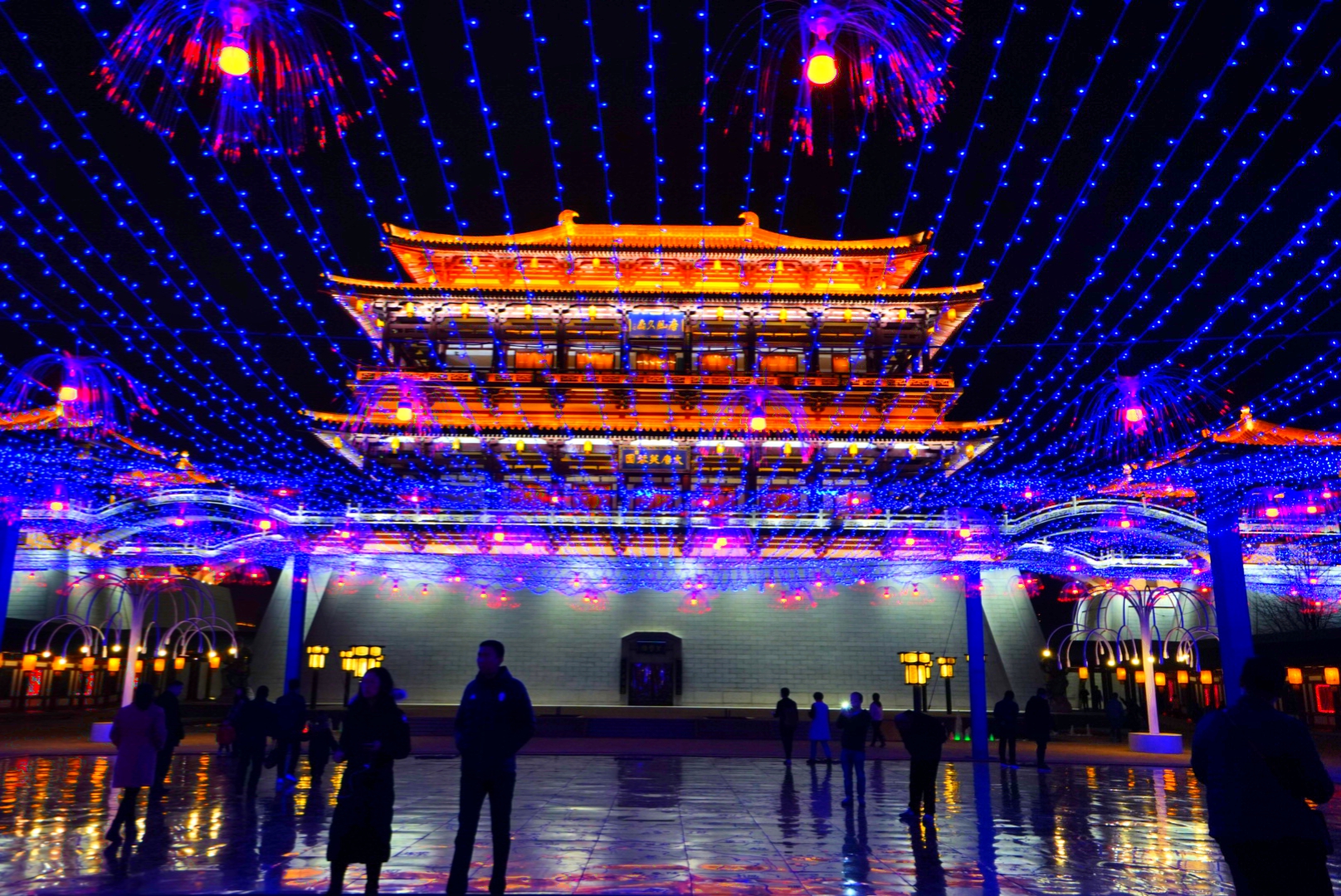 #冬天最适合拍照的旅行地#西安大唐芙蓉园以炫酷的灯光秀吸引世界各地的游人前来观看上元灯会,欣赏璀璨绚丽的夜景。大门外的龙凤呈祥高大壮观,呈现出繁荣盛世的祥和与安宁。