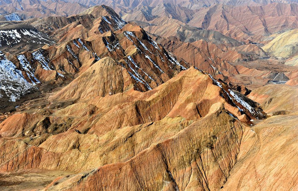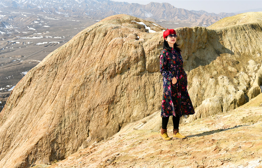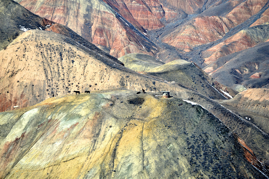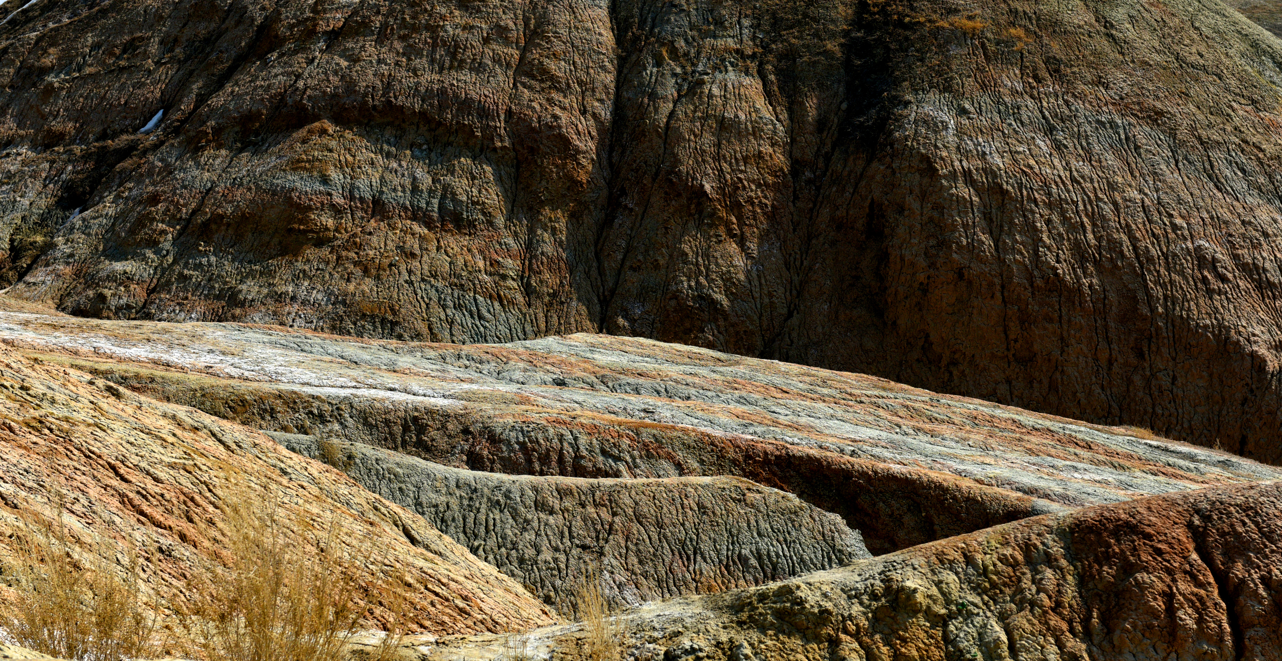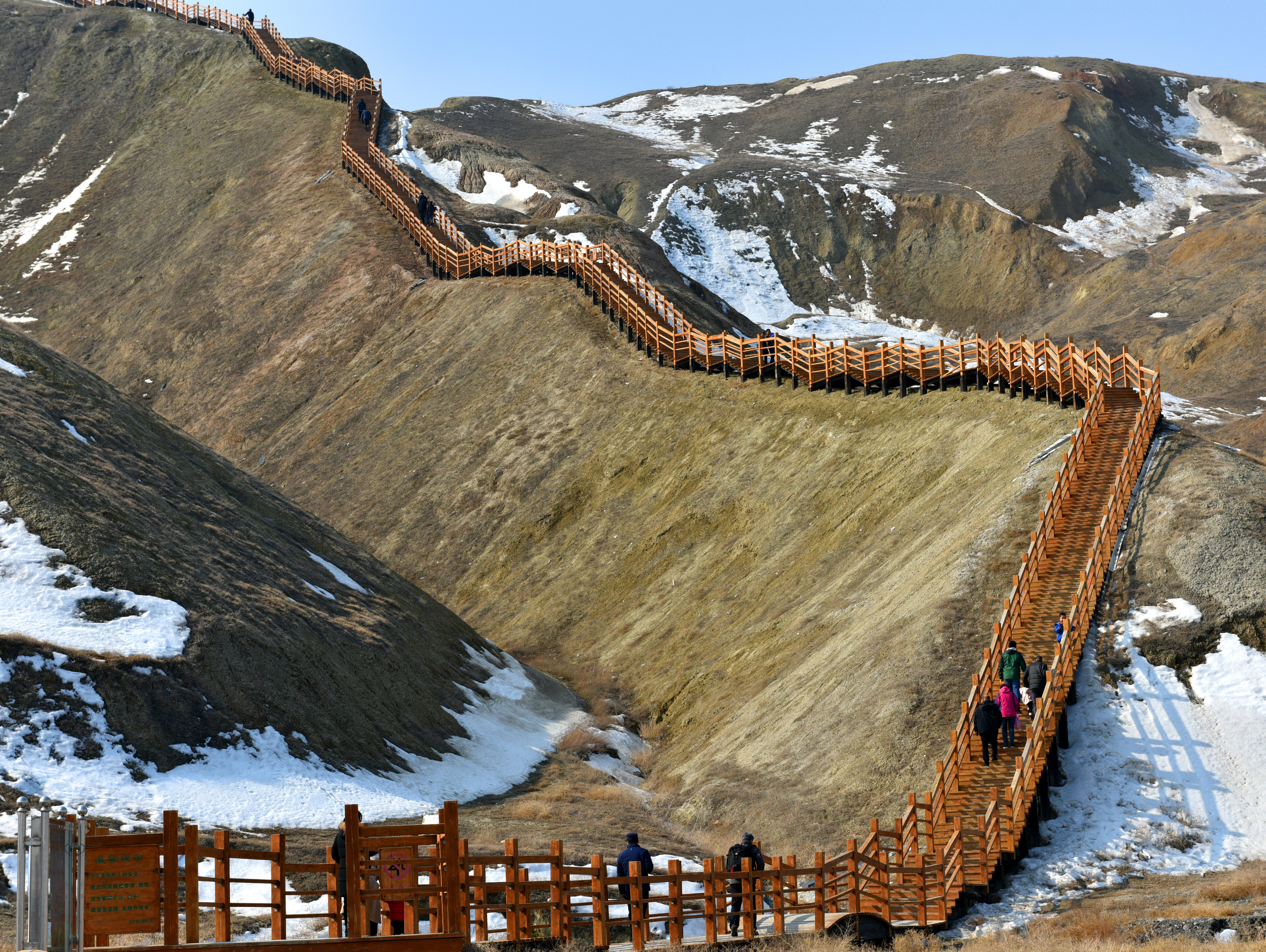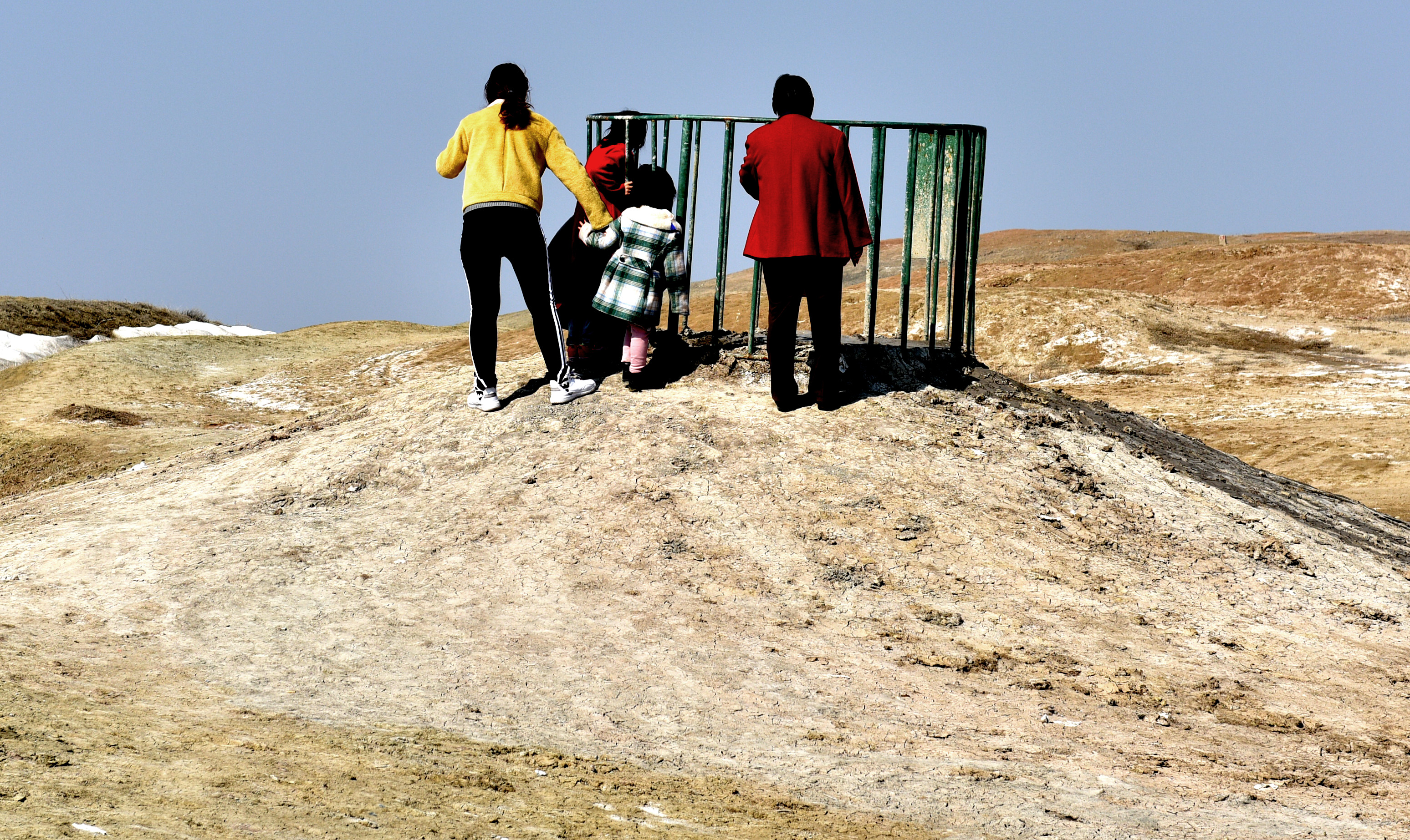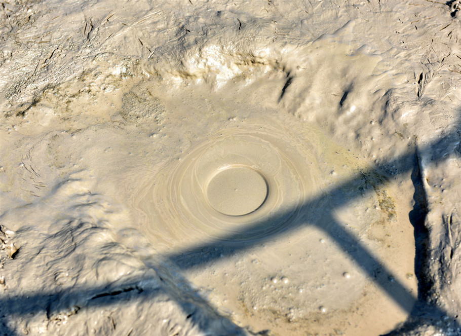 泥火山是地质学中的一种现象,也是少有的地质奇观。在我国,仅仅分布在新疆和台湾的高雄、恒春一带。在北疆克拉玛依市独山子区,就分布有泥火山这种少有的地质奇观。该泥火山位于独山子城区西南约一公里的独山子山北峰上,海拔高度900多米。三月的北疆,气候已经开始变暖,温度有五六度的样子,但城市、乡野还未变绿。山下有铺好的木栈道通向泥火山,有许多游人带着孩子,或者全家出动,通过木栈道上山游玩,观看泥火山和丹霞地貌,或者作为健身运动的好去处。独山子泥火山南北长7公里 ,东西宽6公里,最高峰1283米,孤立地倾斜于平原上。山下一公里远的地方就是城市,身后隔着一道沟,就是水墨、巍峨的北天山,真的是好神奇。在喷发口,溢出的泥浆形成了一层又一层的圆圈,并且有轻微刺鼻的硫化氢和沼气的味道,这些气体有的是可以点燃的。试探性地用手沾了一点泥浆,发现是凉的,并不是想象中的热的烫手,难怪人们把泥火山称为“凉火山”。