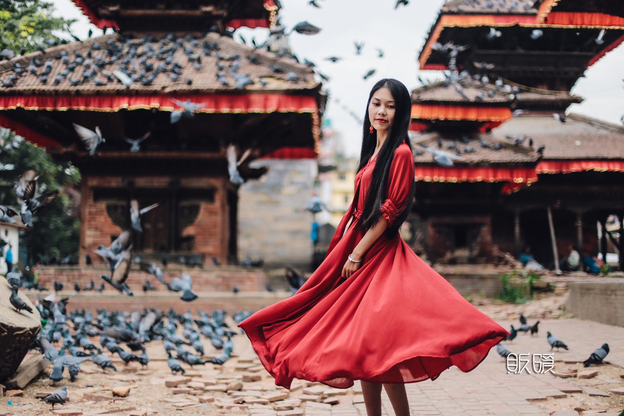 另一种搭配就是有红色元素的花色长款连衣裙,