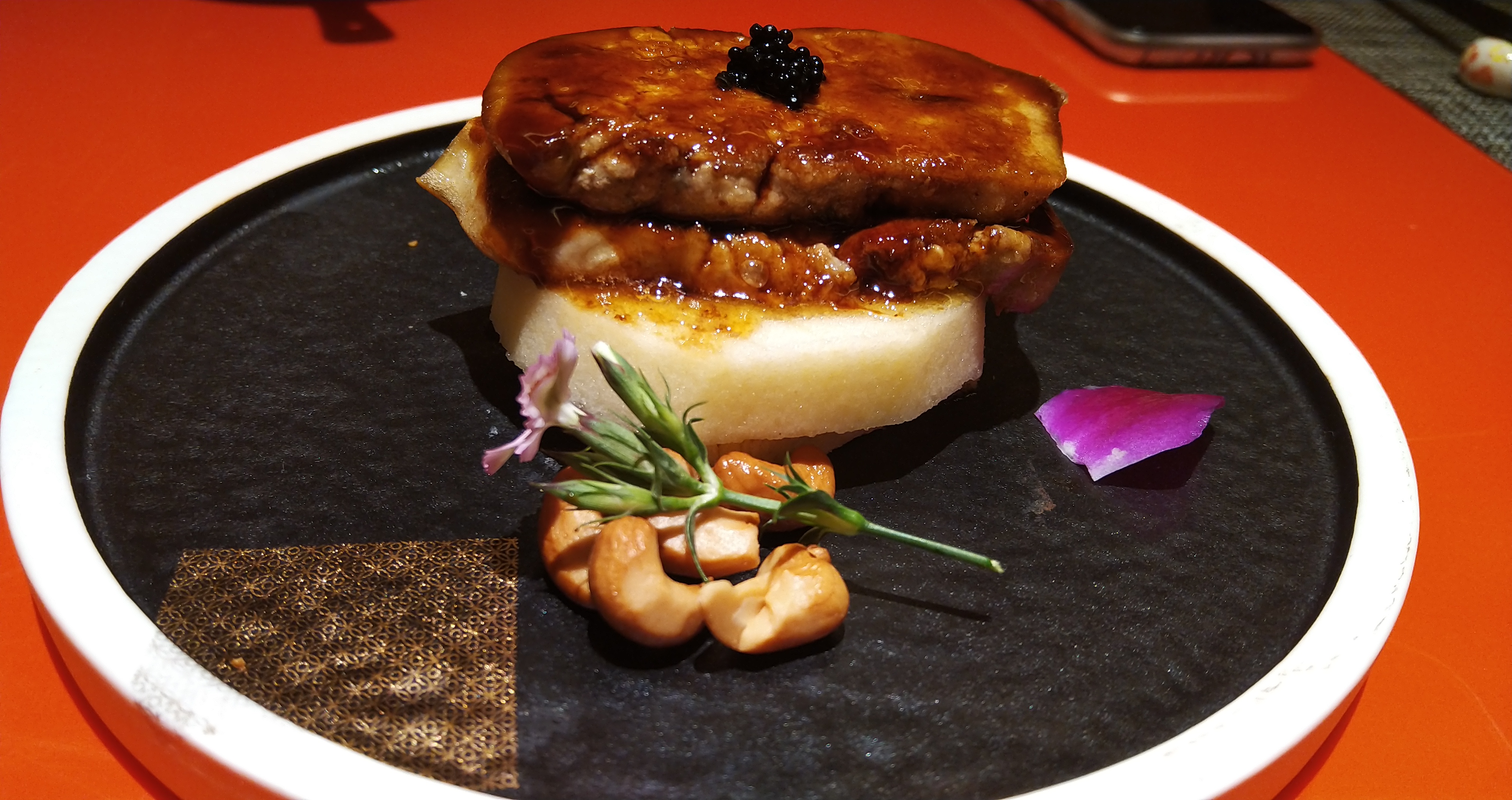 杏仁片裹着大虾,偏天妇罗的做法,非常新奇口味也很nice!芦笋炒虾仁,是日式家常的做法,很清爽。松叶蟹做的清汤火锅,太优秀了吧!蟹的高汤直接涮煮蔬菜,里面的豆腐吸满了汤汁,很嫩很入味,茼蒿也超好吃。每人一份的红酒渍苹果配法式煎鹅肝,摆盘超高级的呀!这一餐吃下来非常舒服,物超所值! #寻找特色美食#