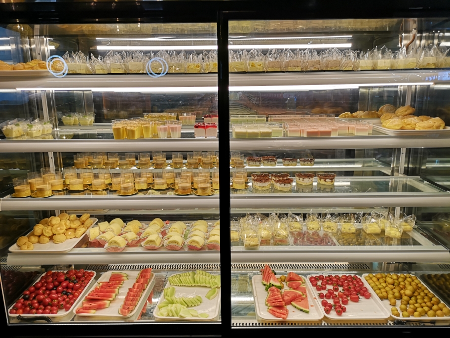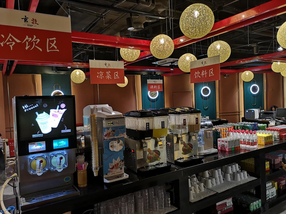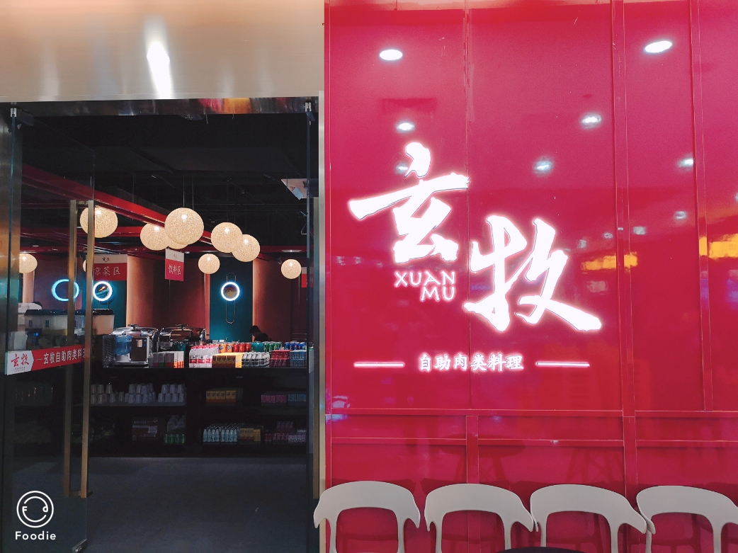 【环境】简约明亮的红色门头背景墙上玄牧两个发光字体醒目又不失得体,店内格局整齐划一,中间是取餐区,两侧是用餐区,功能划分一目了然。深色调的内装在红色结构吊顶和球形灯的照明下显得格调满满,给人不一样的用餐体验。用餐区肉类、蔬菜区、水果甜品、饮品都进行了合理分区,方便顾客取餐。
