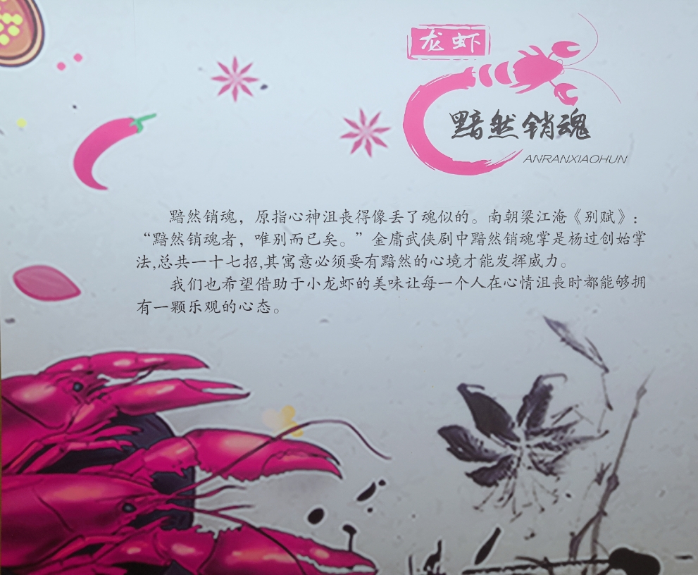 #寻找特色美食#黯然销魂?武侠?武虾?名字好酷!在新街口天桥下的这家小龙虾馆,门头不大,倒是挺深!就像武侠片里的绝世武功,要么不出手,出手了,你就逃不了咯!墙上挂着黯然销魂虾的由来!