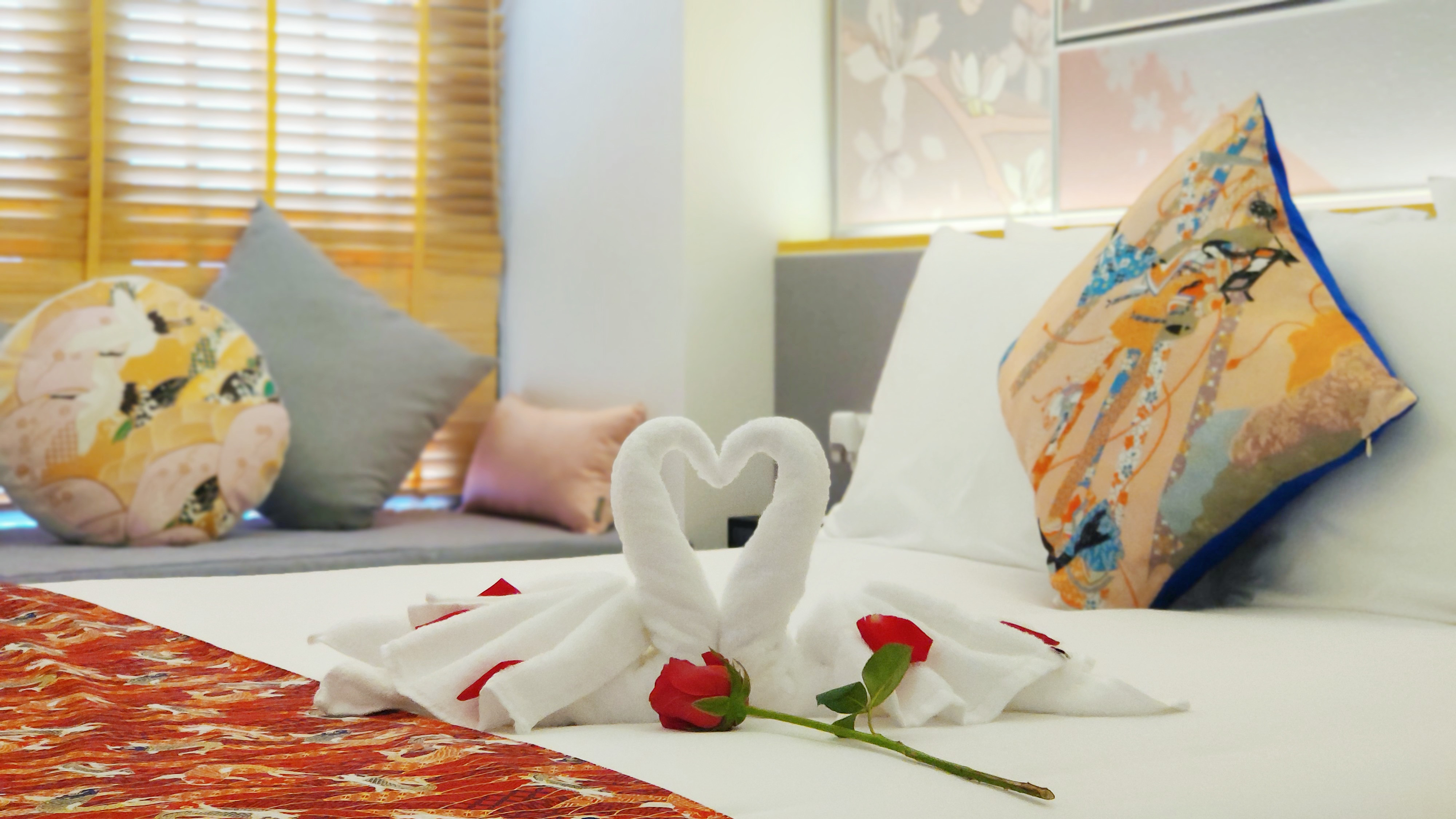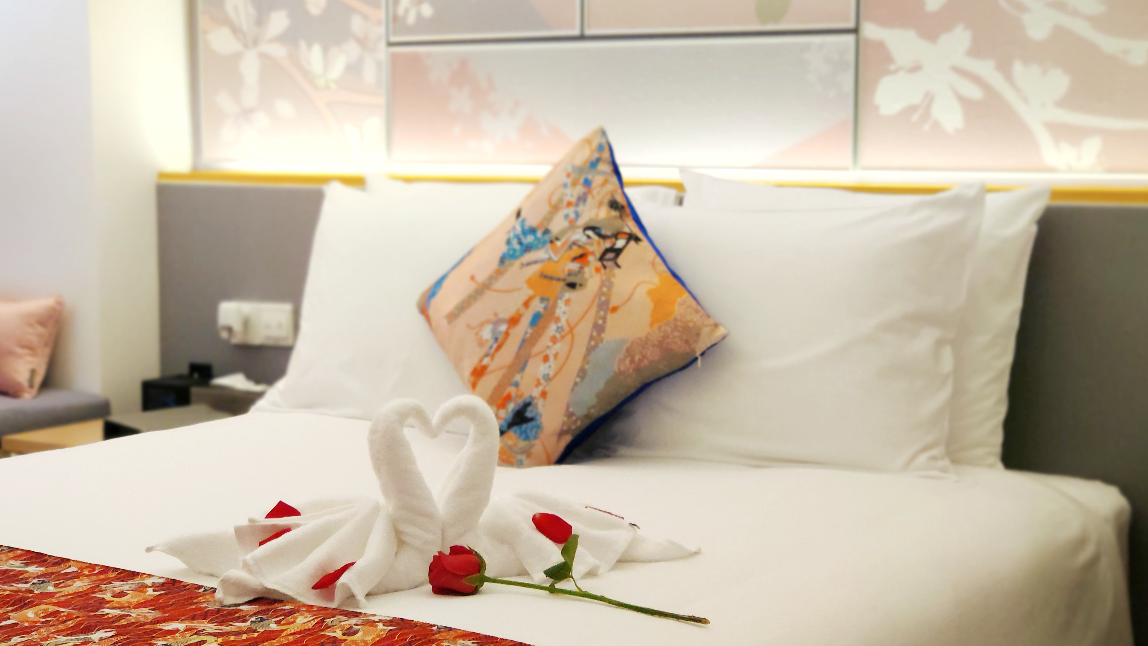 🛏很Q很生动的毛巾折叠——两间客房的床上都洒了不少玫瑰花瓣,还窝着一对毛巾折成的天鹅,脖劲处更是被凹成了心形,满床的爱啊!