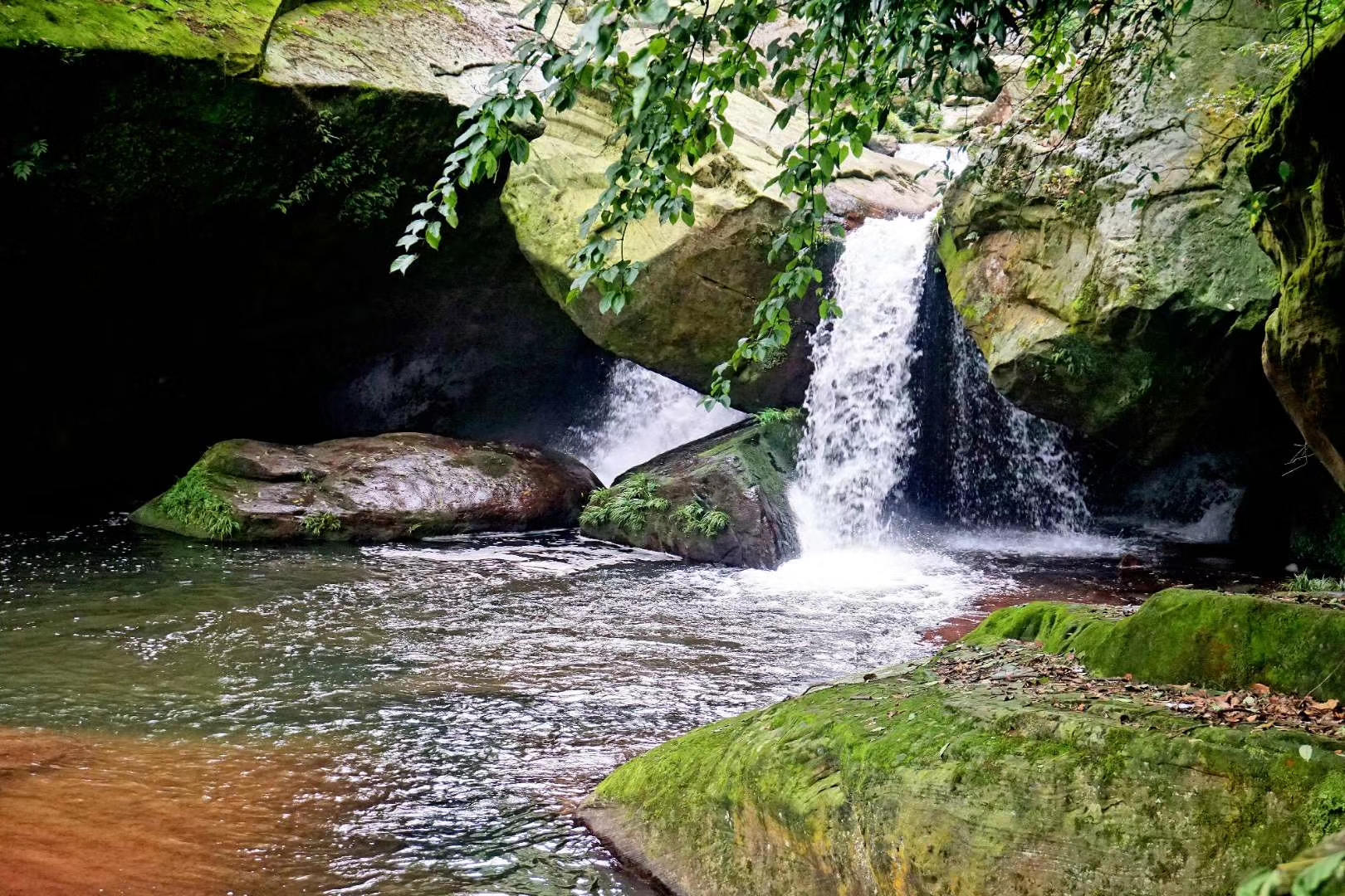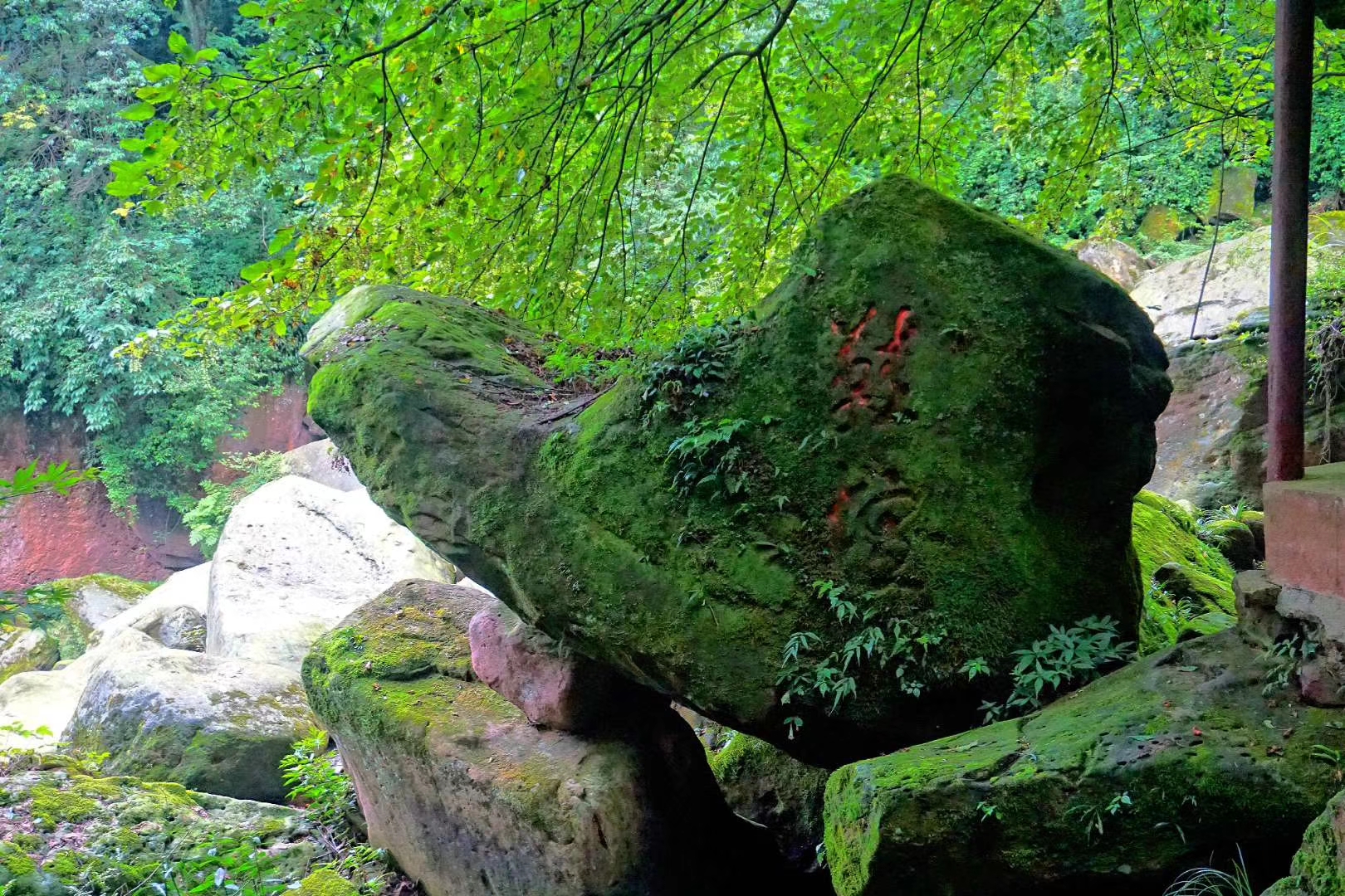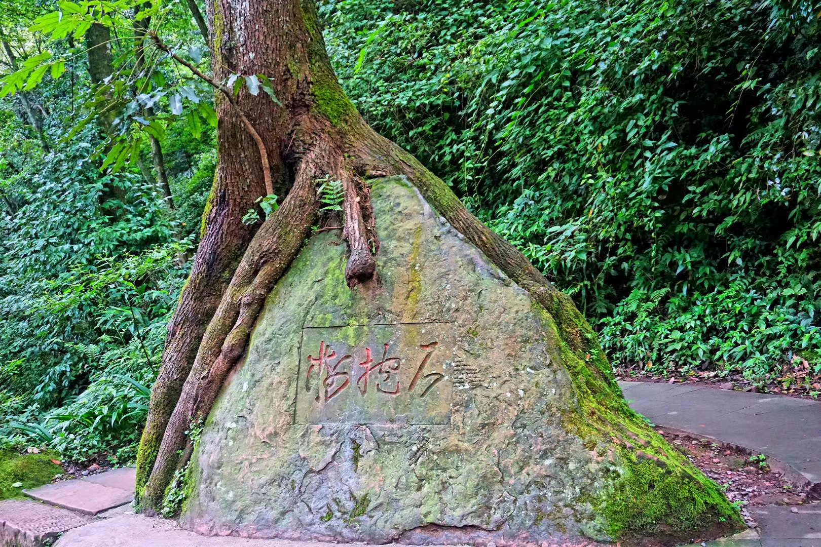 从天台山的等乐安去山门是一条下行的山路,一路清爽,听溪水与石头碰撞的叮咚声,听溪流穿过石缝的潺潺声,宛如动听的音乐在耳边响起,途中还可以看到树抱石、鞋楦亭等独特的景色,这些天然形成的奇特谓之大自然的天斧神功。