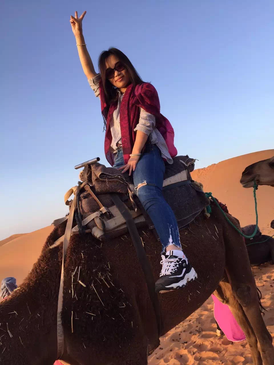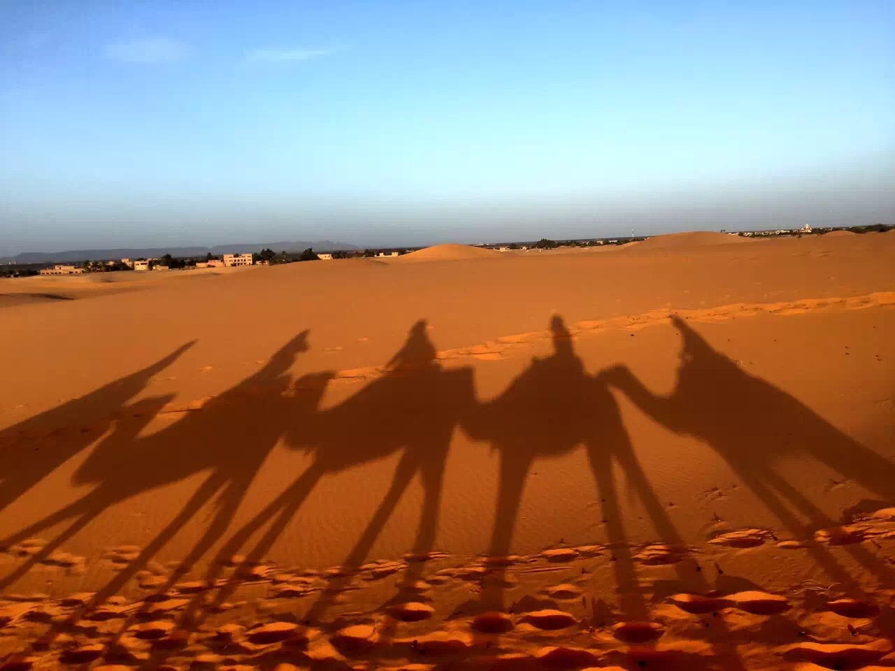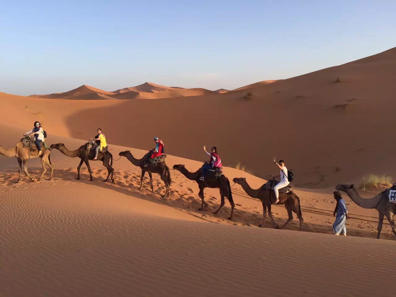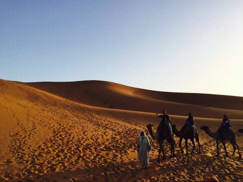 #撒哈拉沙漠#因为三毛的撒哈拉,使得增添了一份神秘,九分向往。在我终于抵达撒哈拉的时候,心情颇为激动,可惜在我的撒哈拉没有荷西,但有我的小伙伴们组成的骆驼队伍。清晨,我们在当地向导的带领下,骑着骆驼驶向我们的沙漠山丘,欣赏那一刹那的日出,骆驼有点慌,别看照片那么赞,但是真心很危险。