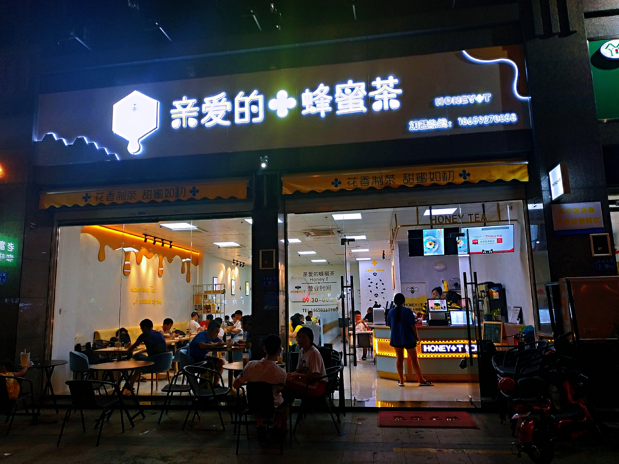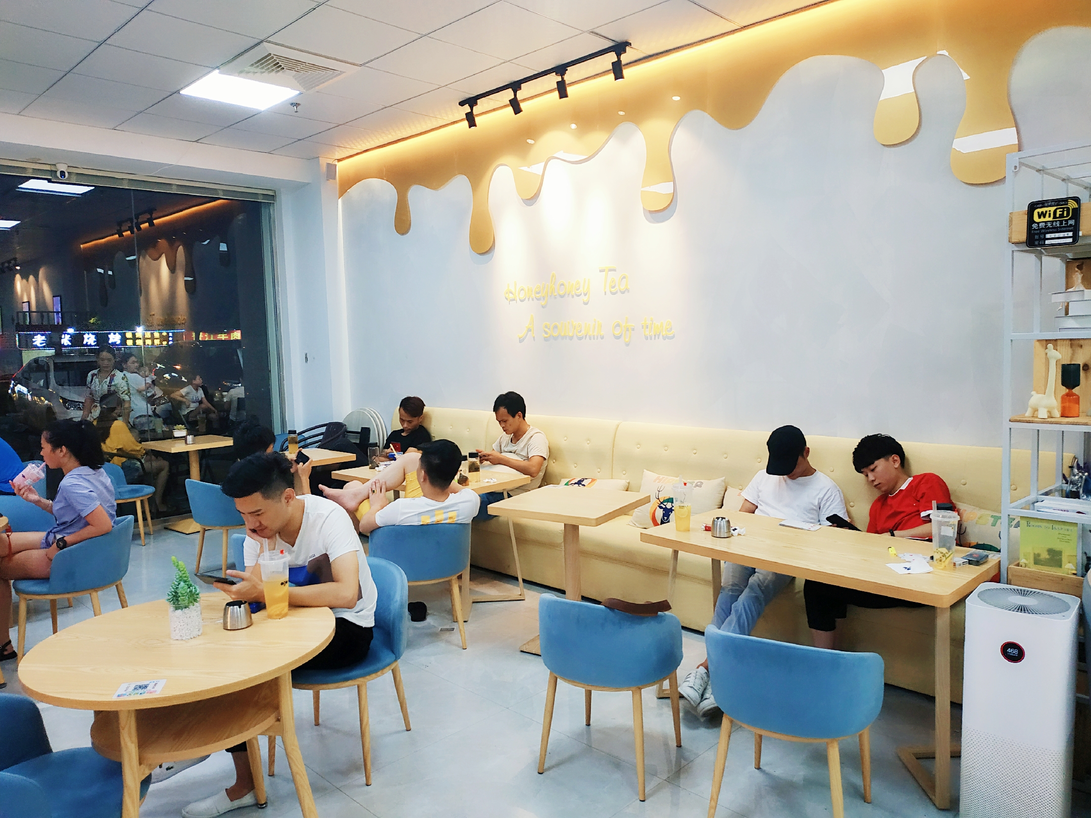 亲爱的蜂蜜茶刚好就开在了家门口!未进店内,入口可以看见黄白相间,简单清晰的门帘,店里的桌椅互相之间摆设的距离刚刚好!透明的玻璃窗也使得空间变得更加的通透。