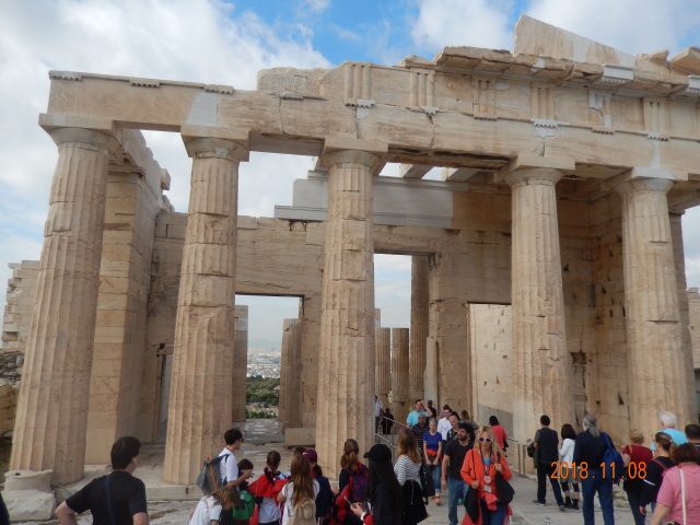 卫城的山门是一个不对称品字型的建筑群,卫城的唯一入口。只见山门的外部有十几根雄伟高大的多立克式石柱魏然屹立在陡峭的石阶之上,石柱的后面是山门建筑。这座山门修建于公元前437年至前432年。建筑师依山就势,巧妙地将这座规模宏大的山门修建在山体西侧的顶端,数根粗壮的石柱组成的柱廊以及后面的山门建筑是如此的壮观。