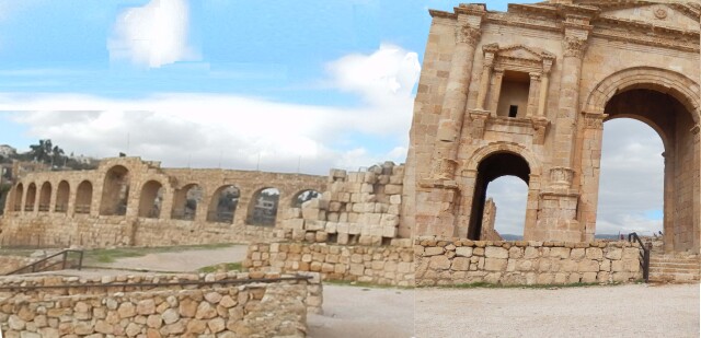 杰拉什古城内,有保存完好的哈德良凯旋门、古罗马竞技场、 气势恢弘的椭圆形广场、如队列般整齐的列柱大街、 经历千年风雨侵蚀的石柱残垣, 犹如历史巨人述说着曾经的辉煌。
