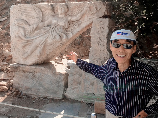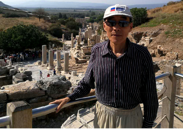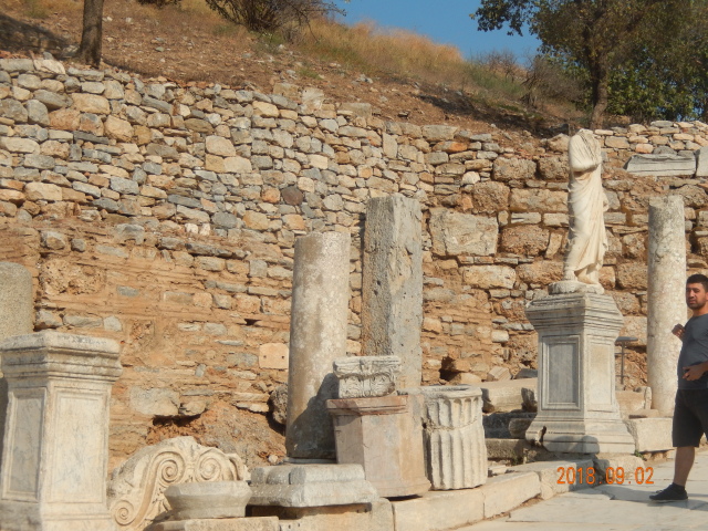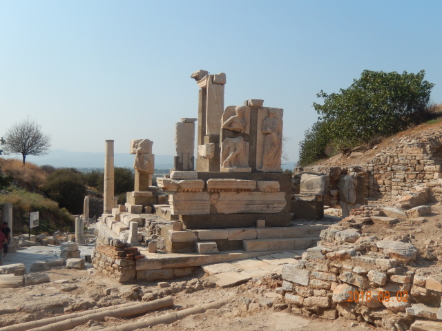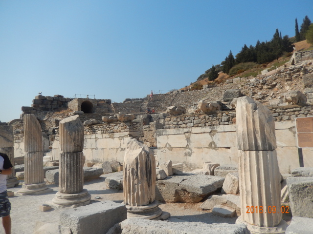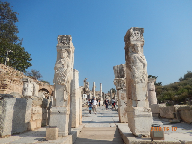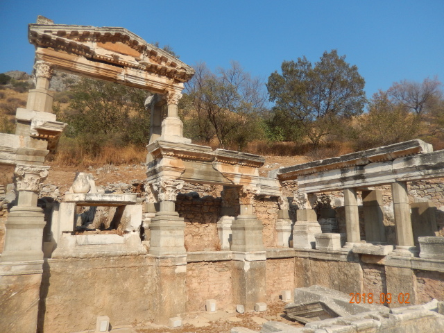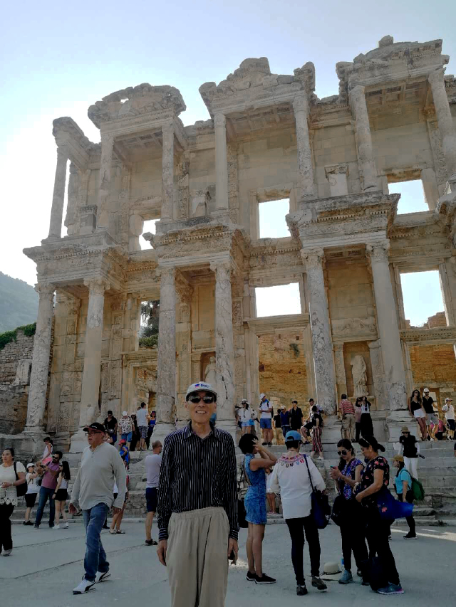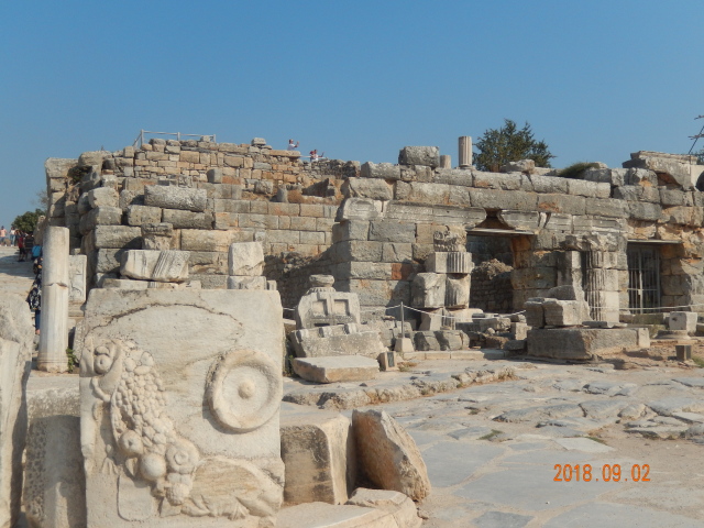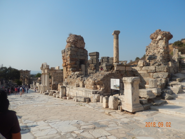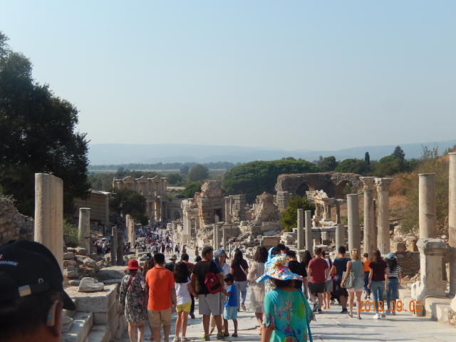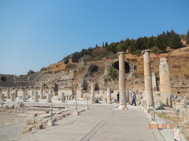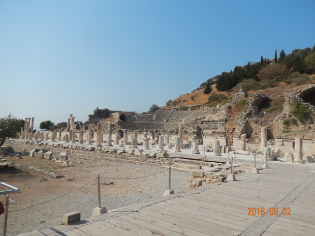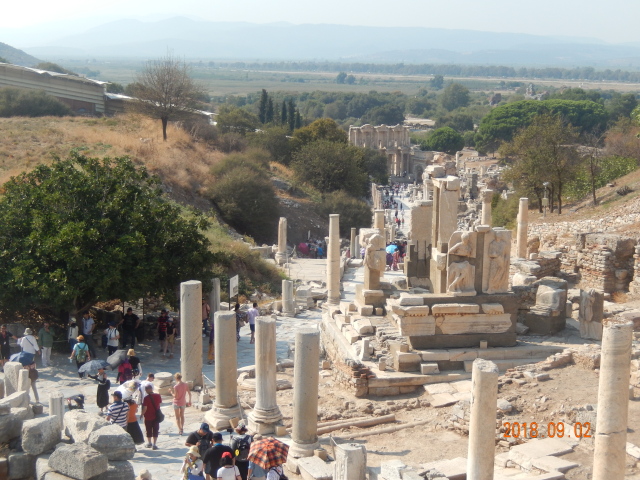 所有看到的只是古城的三分之一。以弗所的繁荣得益于港口贸易,距离入海口不到1公里,远处跑汽车的地方就是当年的大海,在这个台子上可看到来了几艘船什么货的船。但是经过几百年的变迁它的入海口渐渐被淤泥填塞,以弗所赖以生存的海洋贸易遂告终结,加上地中海沿岸频发的地震,以弗所难逃被遗弃的噩运,又经过了上千年最终沦为今天我们看到的大理石废墟。