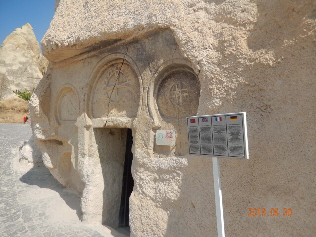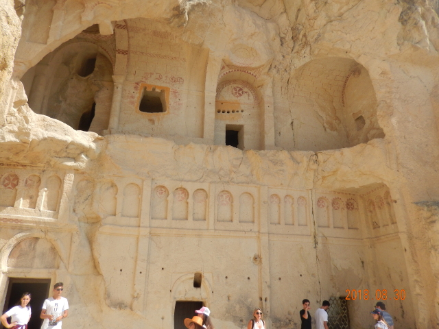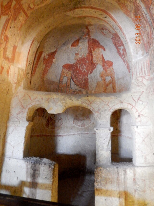 1、格莱美露天博物馆被称为土耳其的“莫高窟”,【主要看点是教堂里的拜占庭湿壁画。教堂的命名即由壁画而来,“苹果教堂”是因为壁画中某人手拿苹果而得名;“蛇教堂”壁画描绘的是圣乔治击退蛇的场景,居住在岩洞中的基督徒们也许遭遇过蛇的袭击;“拖鞋教堂”壁画上的人物无论是耶稣、圣人,还是市井凡人都穿着拖鞋;“黑暗教堂”因为没有一扇窗户、光线昏暗而得名,这也成了里面壁画保存完好的主要原因。这里的壁画色彩和谐明丽、人物生动形象,精美绝伦,是格莱美露天博物馆宗教壁画的代表作。穹顶上绘有耶稣的肖像,俯视众生,它的周围,是《圣经》抄写者和众位圣人的头像以及全身画像。还有一个教堂没有壁画,只在门楣和门框两侧绘有古代图腾式的图案,就叫“无名教堂”。】