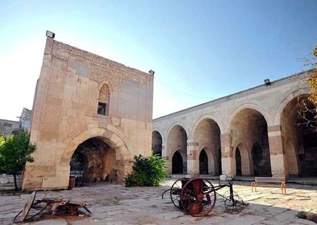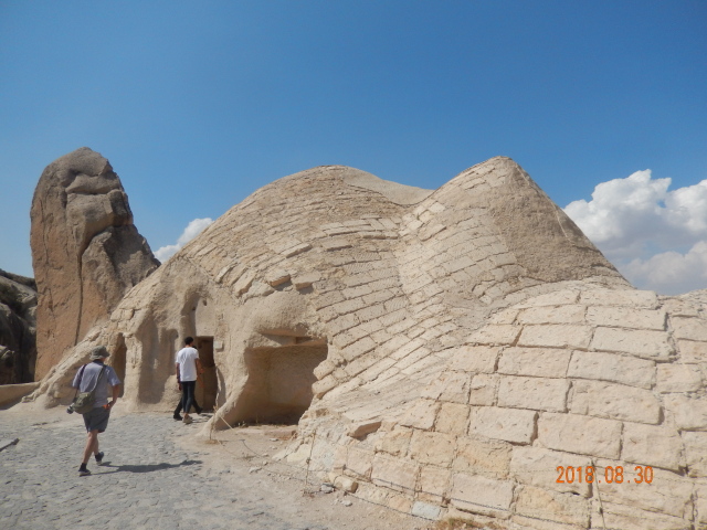 古丝绸之路上每40公里都有一个客栈。因为一个骆驼从早到晚只能走40公里的路。遗留下来的驿站大多已经成为废墟或是毁于战火,这座1229年建的客栈也在1258年经历了一次大火灾,后重新修复,现在还在修复。这种客栈里面有小清真寺、马棚、客房、洗澡的地方和餐厅、厨房。这种客栈前三天是免费的,第四天开始收费。这样如果只有一个商人来了,他为了安全要等下一个商队来了以后跟他们一起走。一般第四天另一个商队就来了,来的人不能只住两三天,要到四天左右休息好了再走。