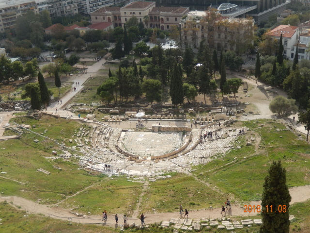 戴奥尼索斯露天剧场, 建于公元前6世纪,是世界上最古老的露天剧场、希腊戏剧的发源地。在这足以容纳17000人的剧场里曾经上演过无数场埃斯库罗斯、索福克勒斯和欧里庇得斯的悲剧作品及阿里斯托芬的喜剧作品。剧场依山坡而建,大得惊人,似凝结了天地大美之气。在古代希腊,观看悲剧不仅是市民大众喜闻乐见的最主要的艺术活动,也是城邦生活的重要内容。由于希腊戏剧都是在白天演出,所以从观众席上能看到乡村的壮丽景象。