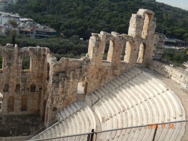 西侧的阿迪库斯音乐厅建于罗马时代,由罗马富翁希罗德·阿提库为纪念其亡妻而建。剧场呈半圆形,直径38米,背靠卫城山的悬崖峭壁的观众席为32级,可以容纳6000人。在古代的时候每逢节日都会在这里举行音乐会和表演剧,剧场至今仍在使用,每年夏季举办的雅典艺术节这里都是主要的演出场地,来自世界各地许多著名的演出团体都曾经在这里留下他们的足迹。