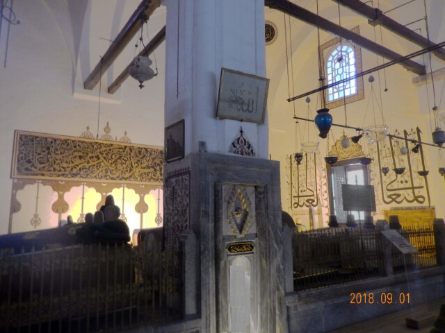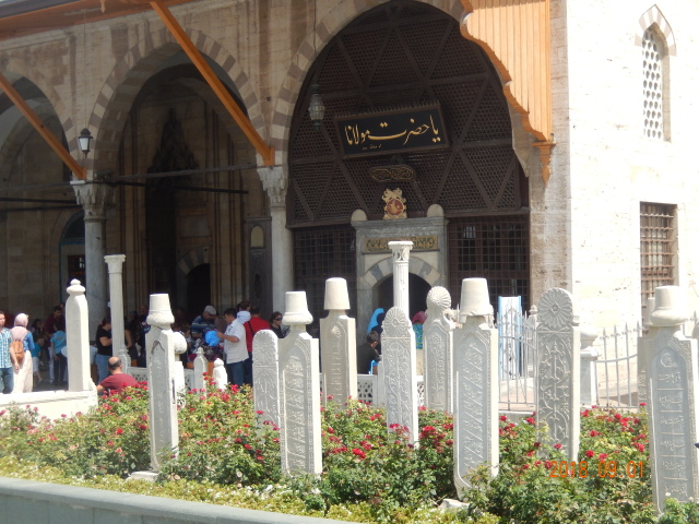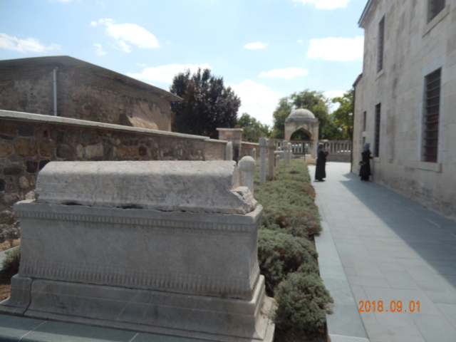 清真寺旁是梅夫拉那的墓地,包括他父亲、他儿子和家属,还有他的学生的坟墓。每个墓碑上都有帽子,上面包着白色或者绿色的布,以证明他们的身份。