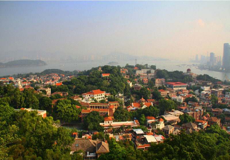 福建省的厦门岛西南角,与厦门市隔海相望。最初,人们把它叫做圆沙洲,也有人叫圆洲仔,明朝时候,由于其中的海蚀洞在受浪潮冲击时,声音好像是在敲鼓,所以,据此特点,明朝先民把它改成了现在的名字。因为一些客观的历史原因,中外不同风格的建筑物在这里得以集中地保留和呈现,在鼓浪屿,形态各异的华丽建筑构成了一道亮丽的风景线,很是养眼,也让鼓浪屿有了“万国建筑博览园“的美誉。鼓浪屿是中国大陆距离台湾岛最近的地方,肉眼就可以看见台湾岛土——金门岛。此外,鼓浪屿不仅有天然的海浪打击山崖之声,而且还是著名的“音乐家摇篮”,每当你漫步在鼓浪屿每个角落的小路上,会时不时的听到悦耳动听的钢琴声、悠扬的小提琴声、轻快的吉他声,或者是和缓优美的歌声,这些声音,和之以海浪的节拍,平添了几分浪漫和温馨。可以说,音乐,已经成为鼓浪屿一道特殊的风景线。每当夜幕降临,隔着江面,远眺鼓浪屿的夜景,仿佛就是一座盛大的巨型花园,与厦门中山路上的霓虹灯、高层建筑的射灯和许多彩色聚光灯,交相辉映,闪耀夺目,使岛上、海上、天上三维空间灿烂迷人。